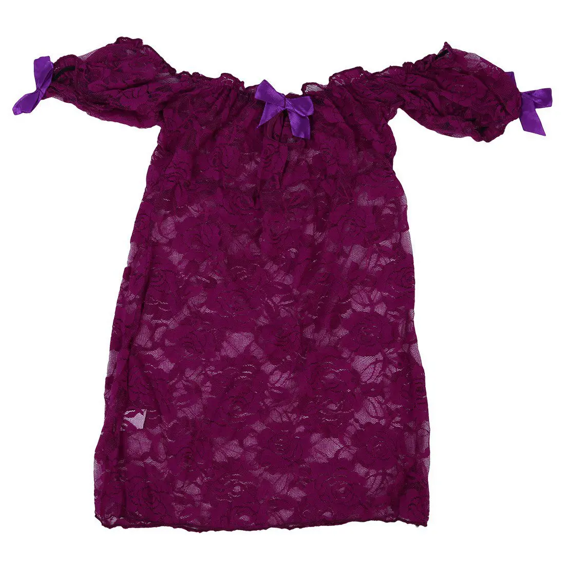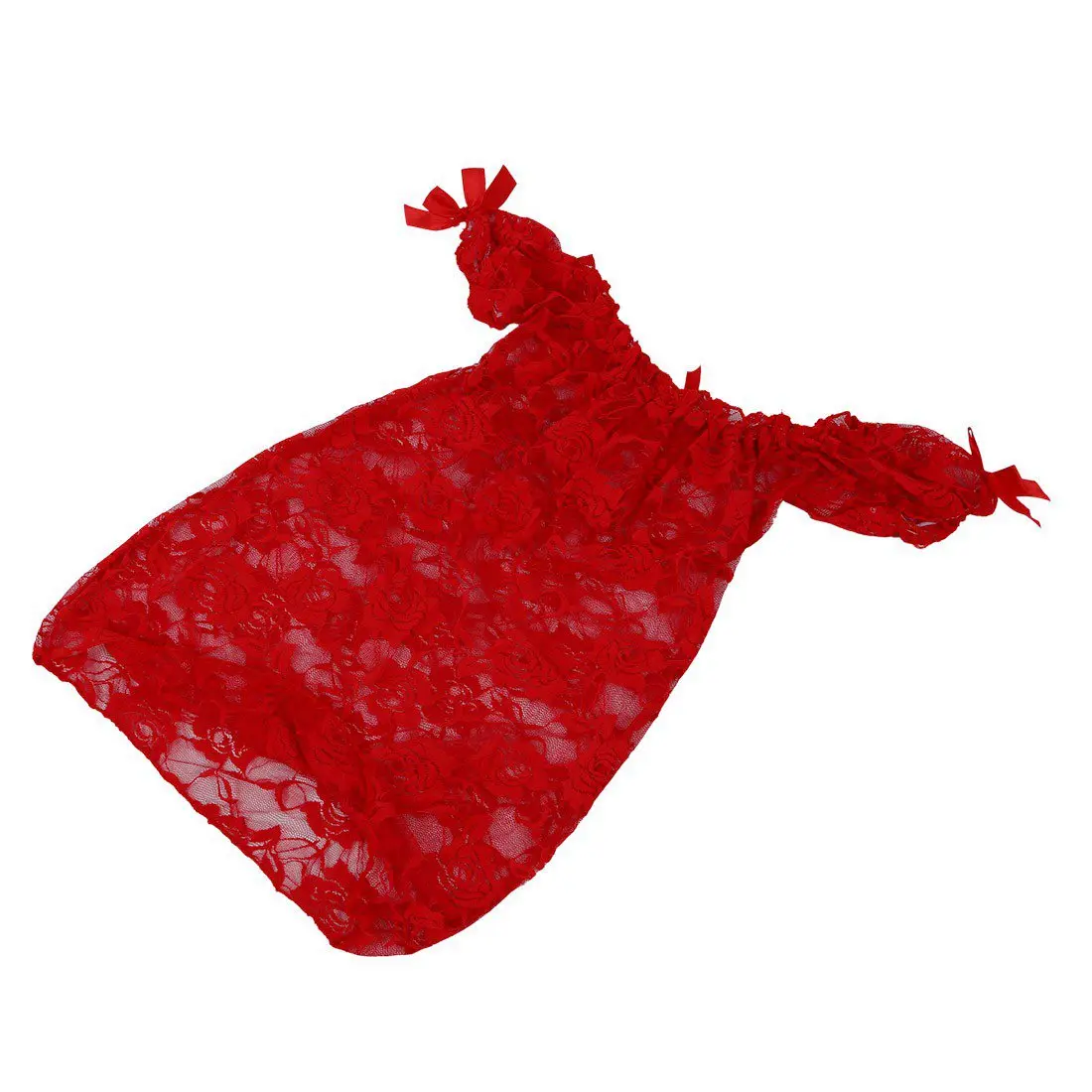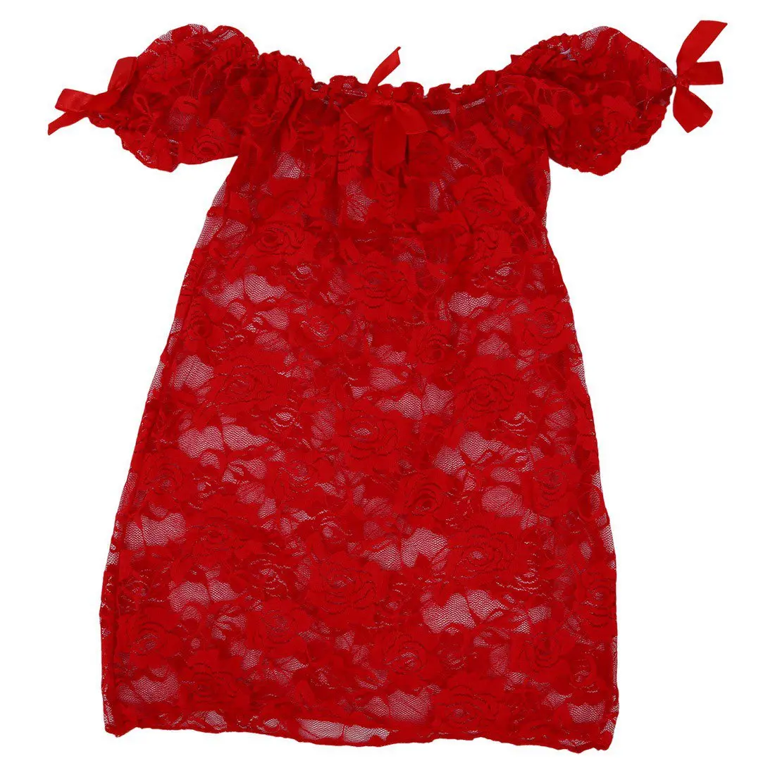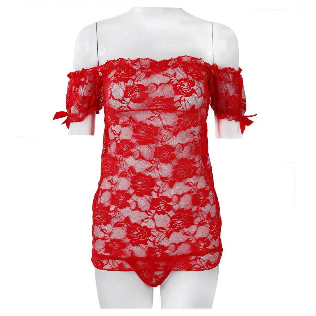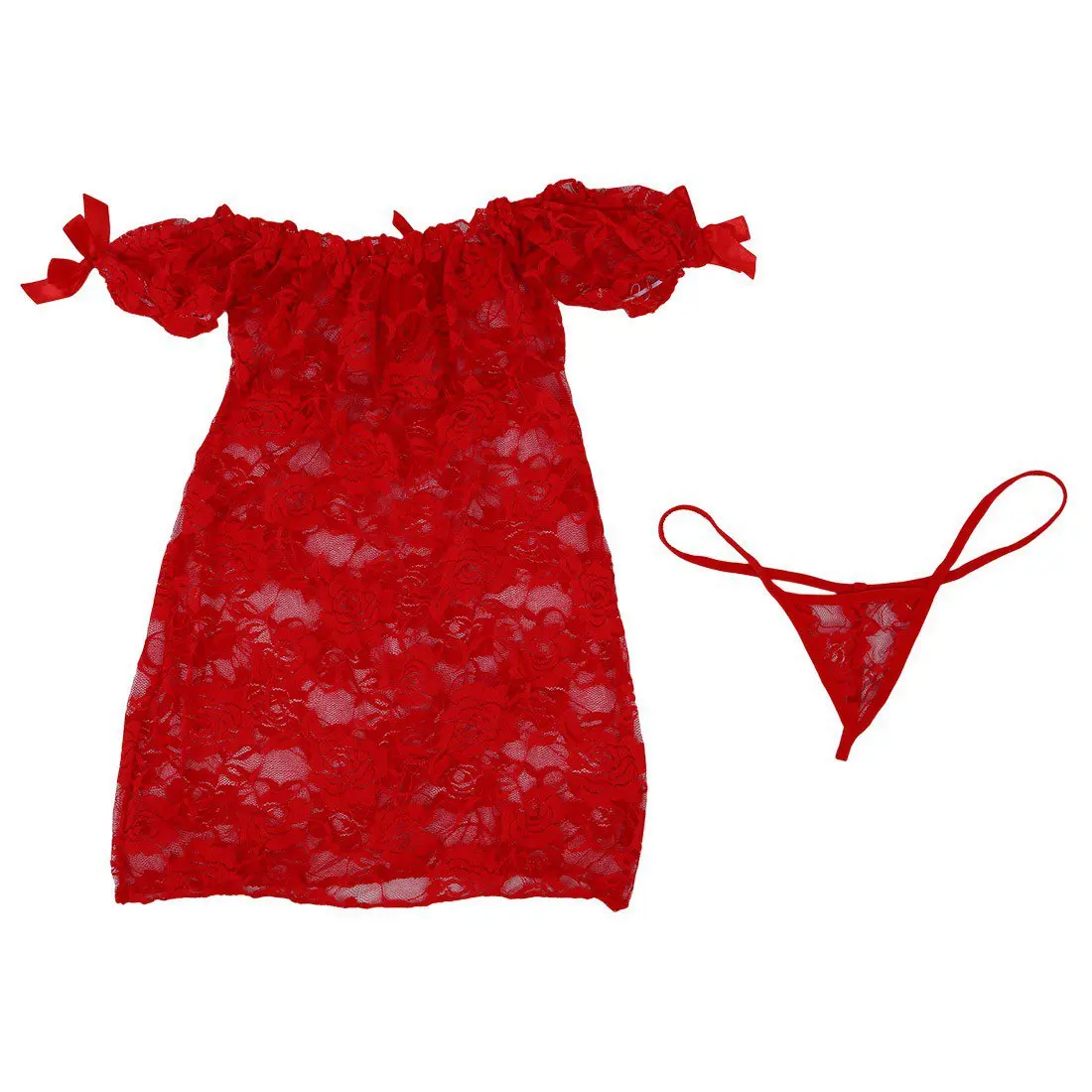 SNOWINSRPING IMC Women Sexy Lace Lingerie Underwear Sheer Babydoll Sleepwear+T-BACK Off-Shoulder Red