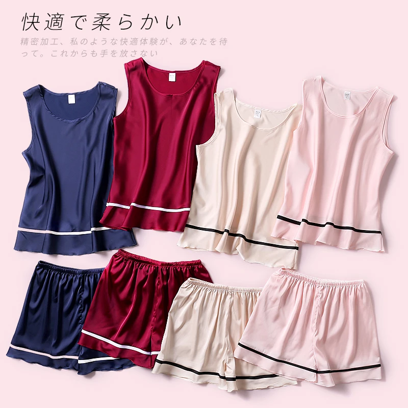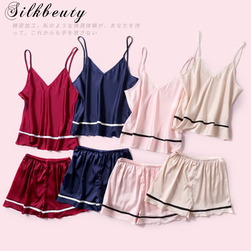 SILKBEUTY Pajamas Sexy Summer V-neck Sling Top+Short 2Pcs Set Sleepcoat Sleeveness Silk Ventilation Women Pyjamas