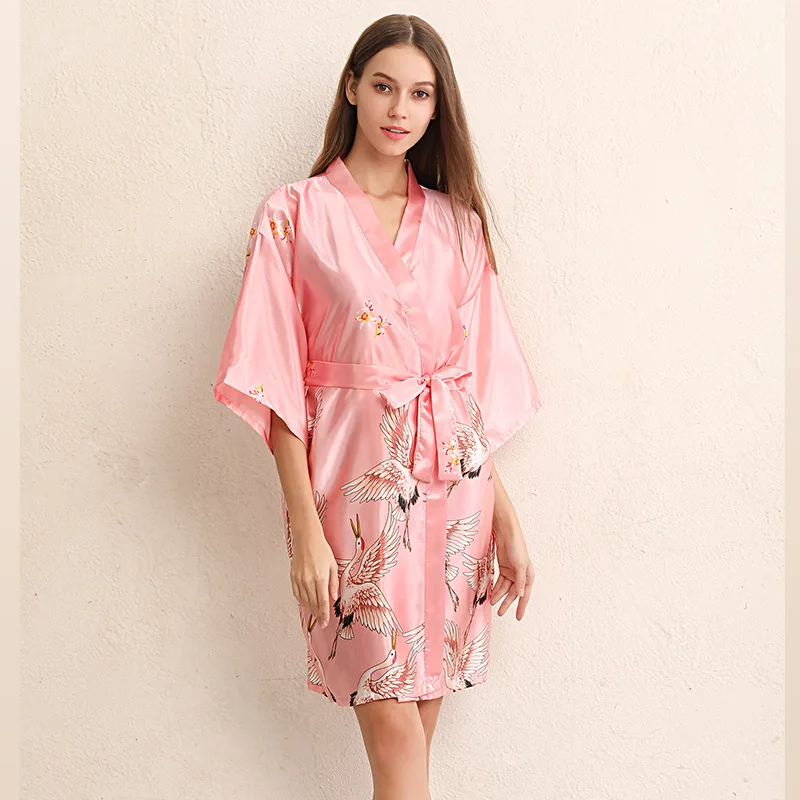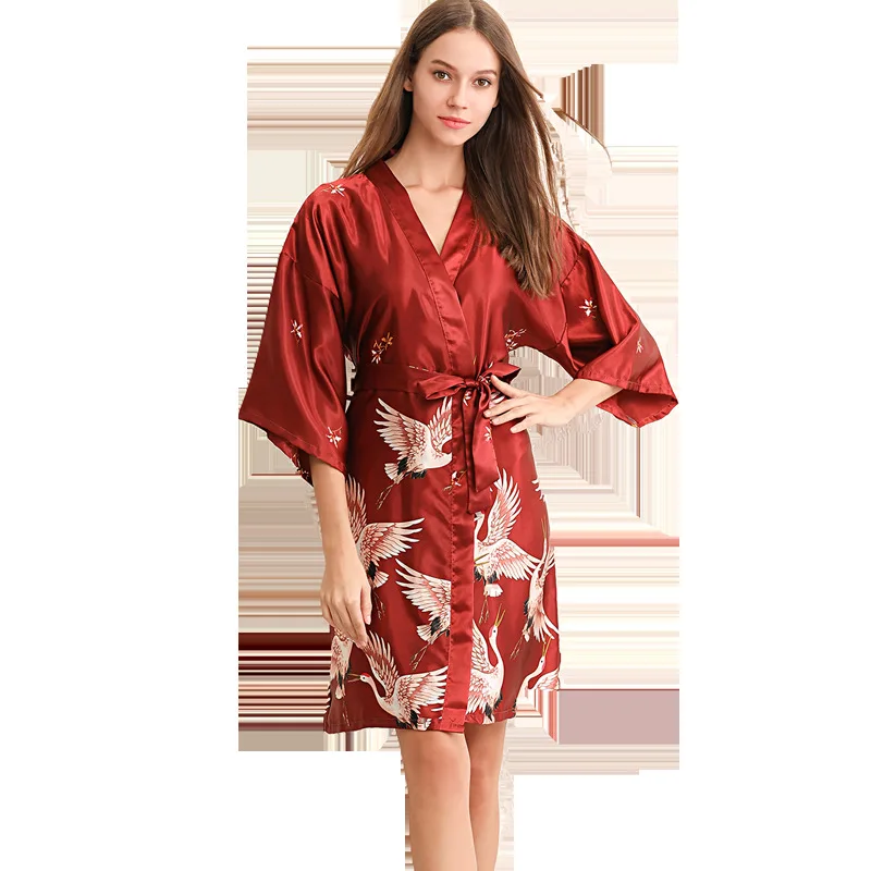 CEARPION Lady Sexy Sleepwear Half Sleeve Print Crane Robe Summer Satin Nightdress Casual Daily Kimono Bathrobe Gown Negligee