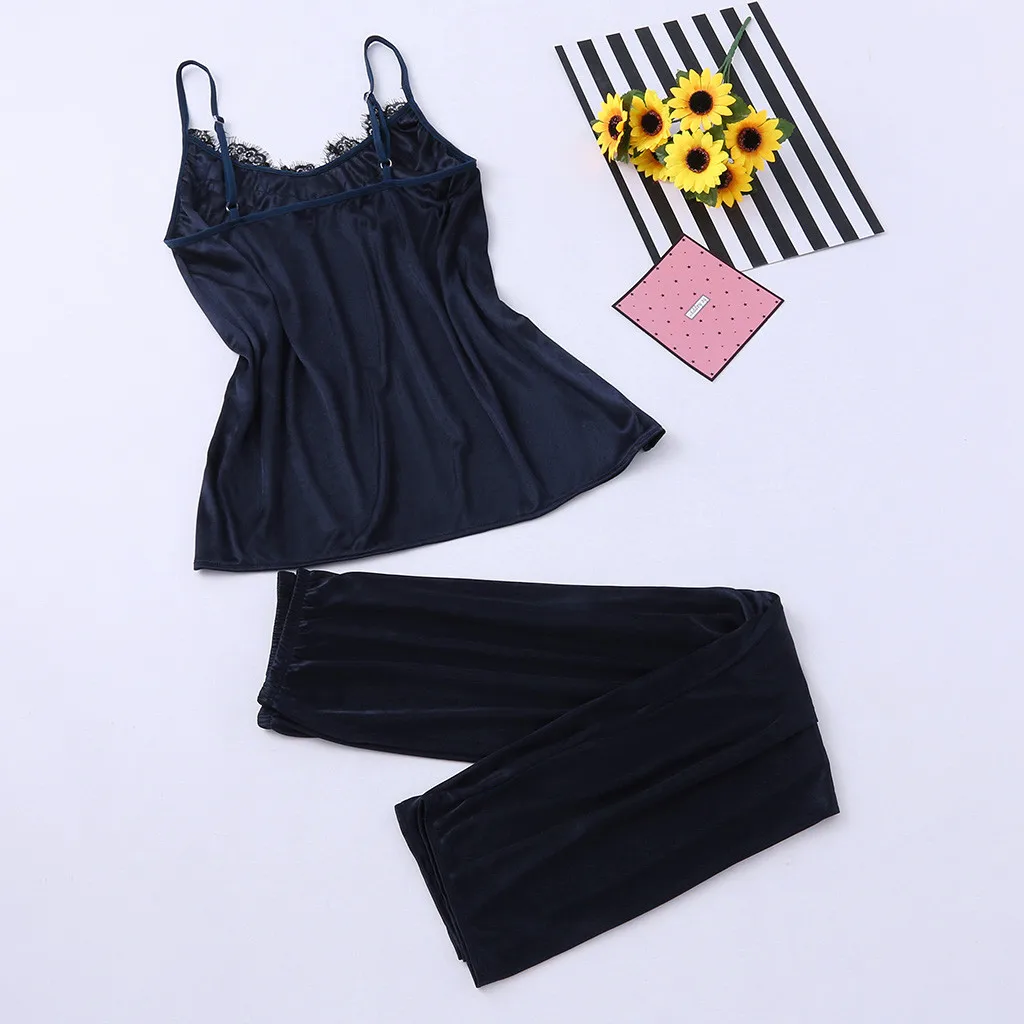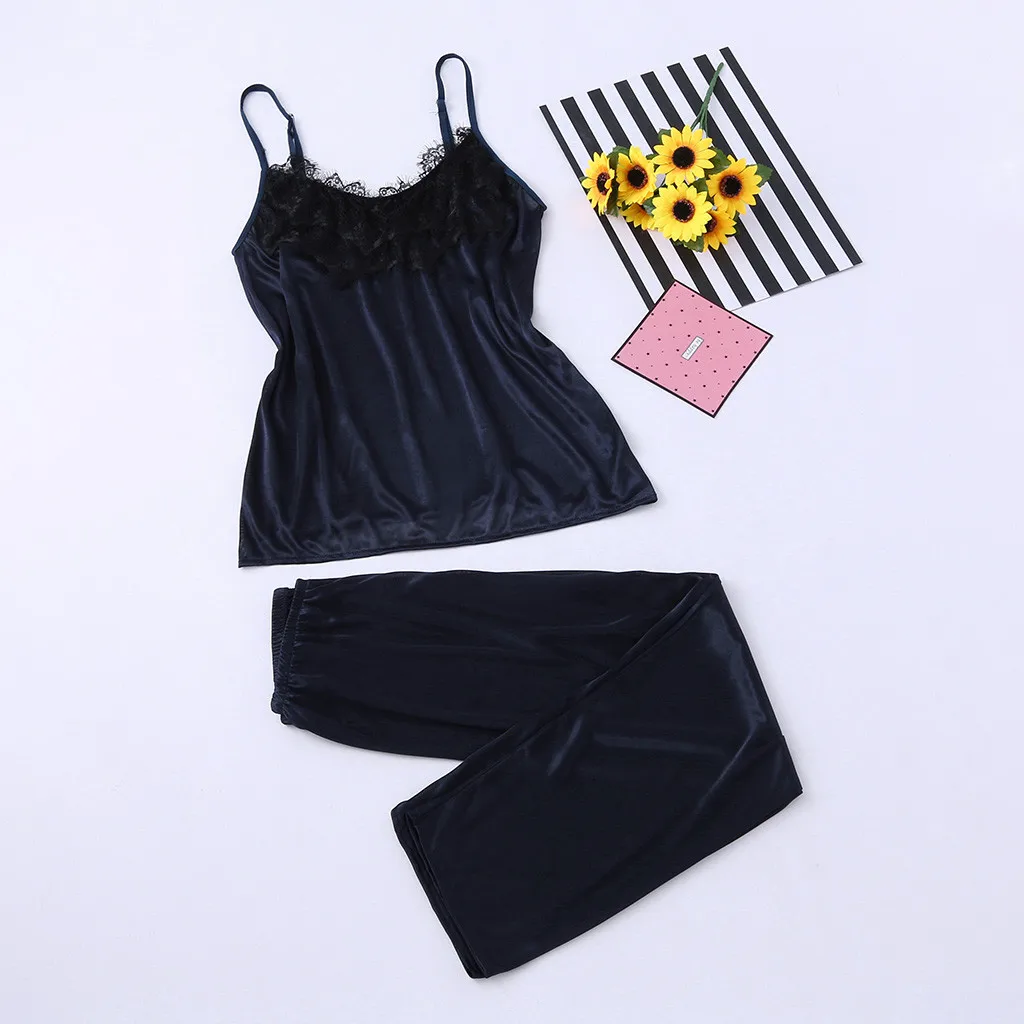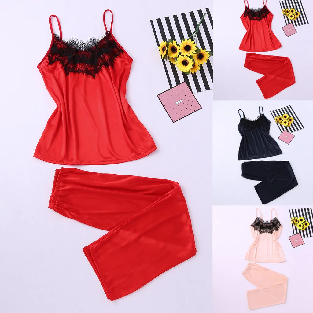 2Pcs Ladies Sexy Satin Silk Sleepwear Babydoll Lingerie Nightdress Pyjamas Suit Pour Femmes Nocturne Home Suit 888