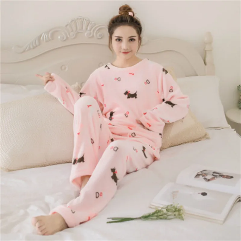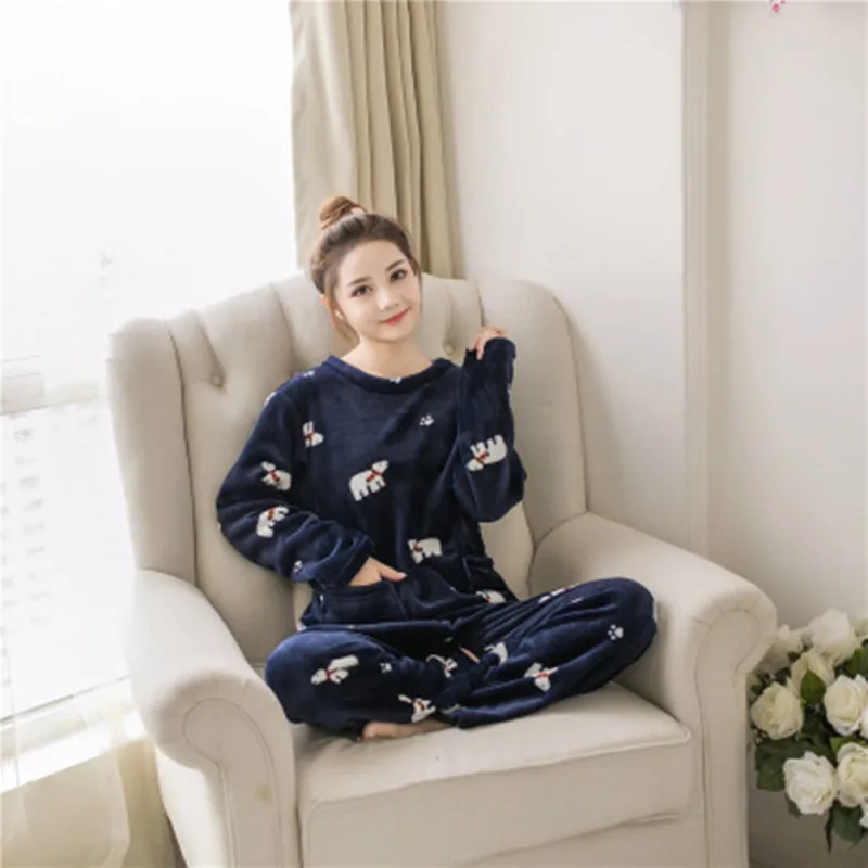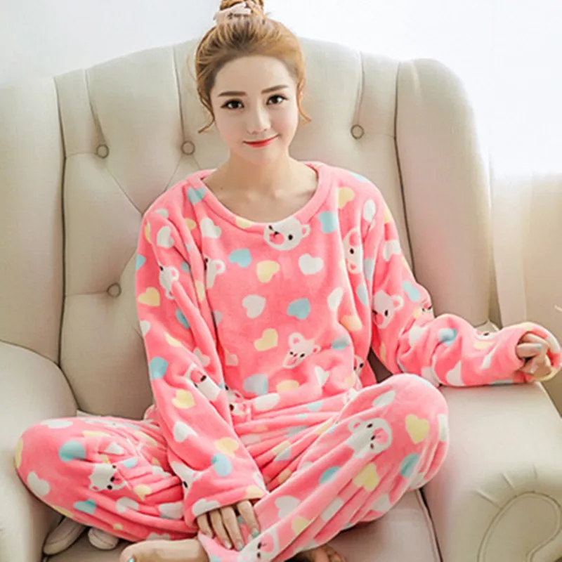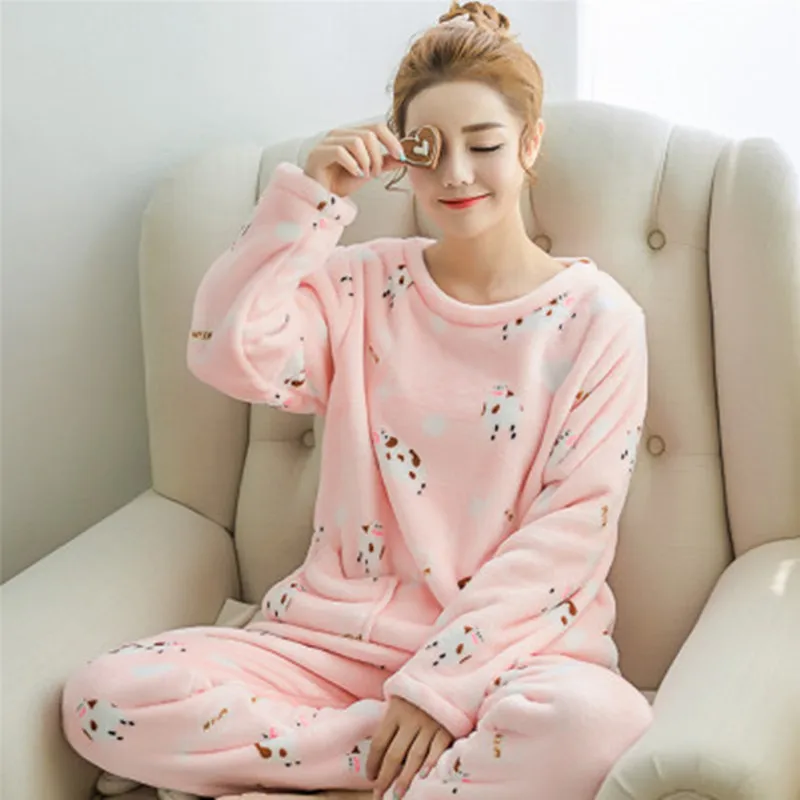 Cute Cartoon Winter Women Pajama Set Thick Flannel Warm Female Pajamas Long Sleeve Full Trousers Two Piece 2019 Top Fashion