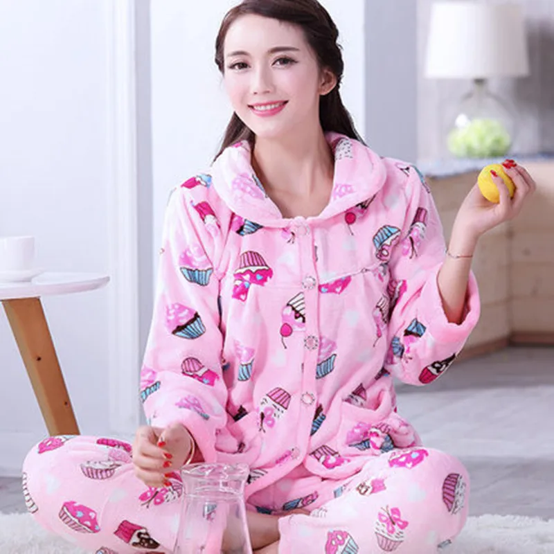 Female Pajama Thick Flannel Cute Dot Print Female Warm Winter Pajama Set Long Sleeve Full Trousers Two Piece 2018 Top Fashion