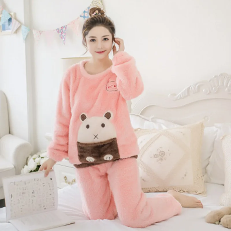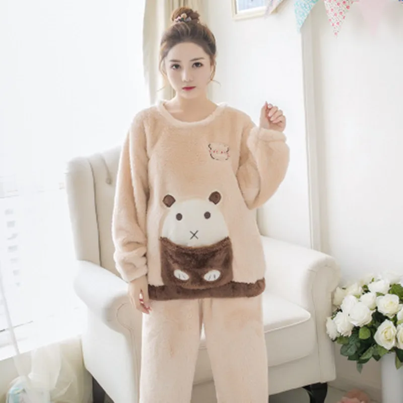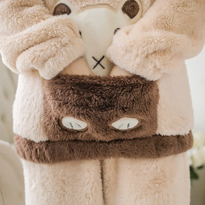 Winter Female Pajama Set Polyester Full Trousers Lady Two Piece Cartoon Bear Pyjama Home Sleepwear Women's Flannel Clothes