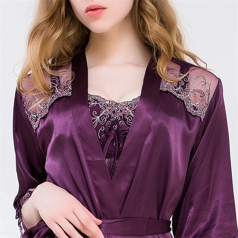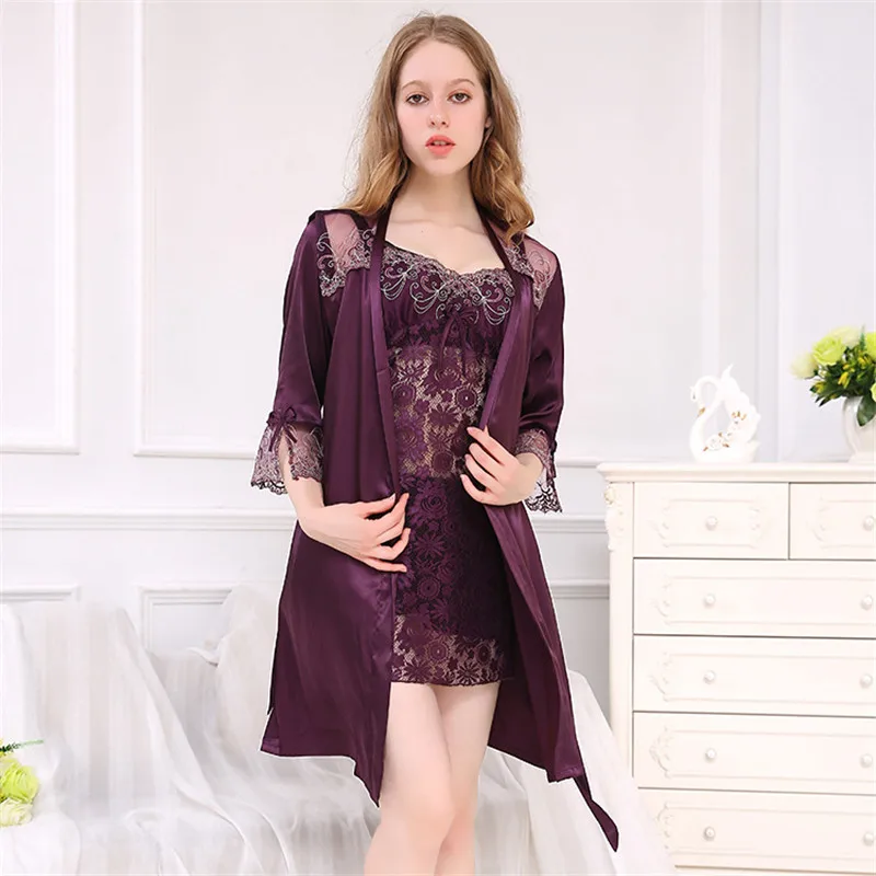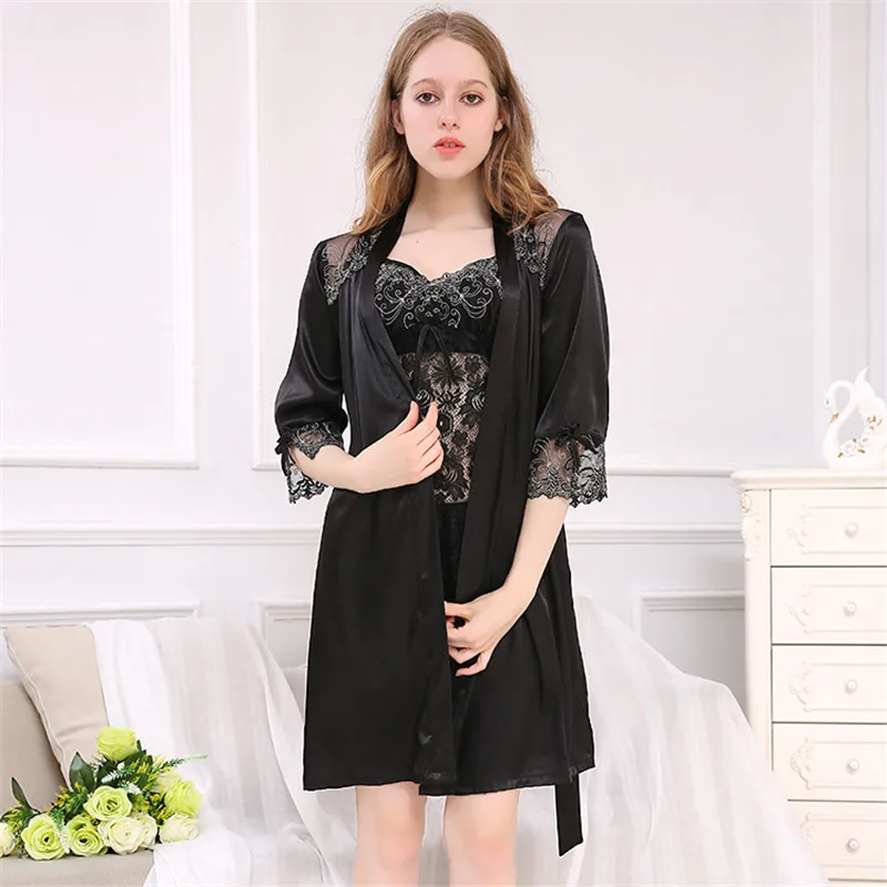Sexy Silk Robe Sets 2019 Summer New Faux Silk Sleepwear Female Sweet Lace Sleeping Robe + Nightdress Satin Silk Bathrobes 1771