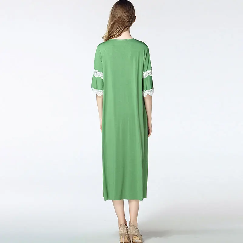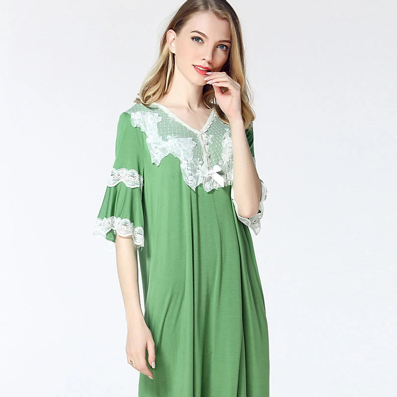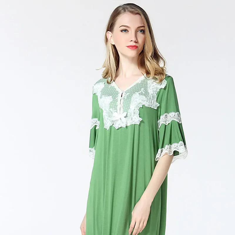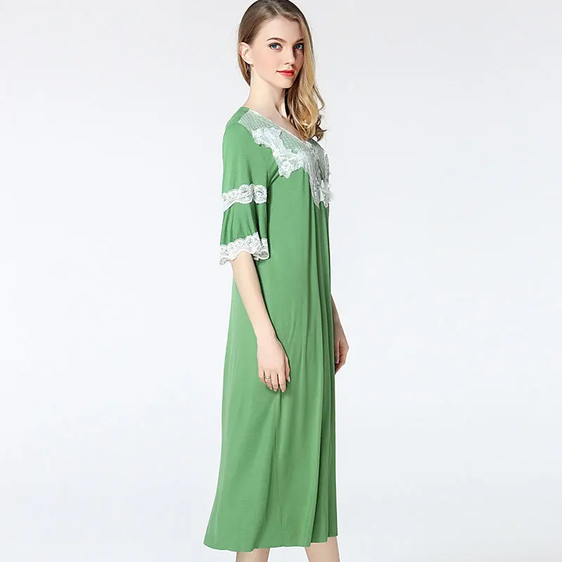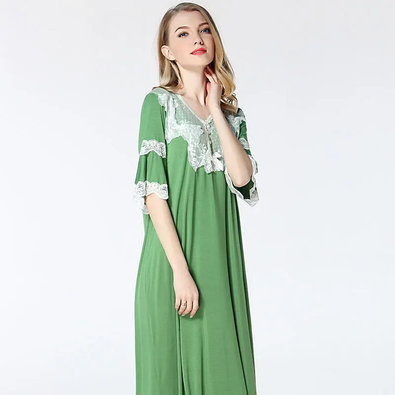 Sleepwear Female Pure Color Lace Patchwork V-Neck Half Sleeve Vintage Long Style Elegant Nightdress Woman Nightgowns L17046