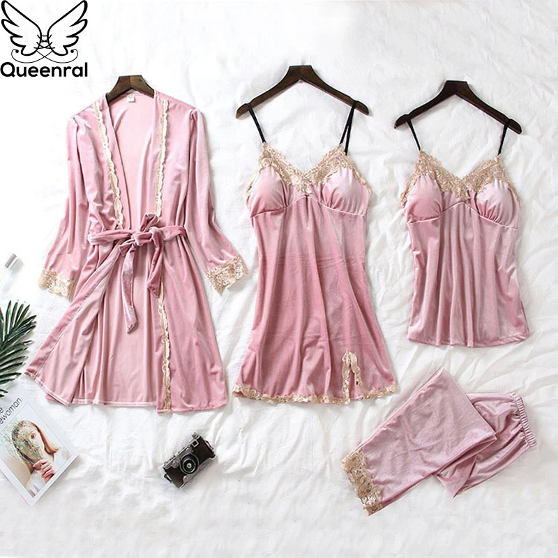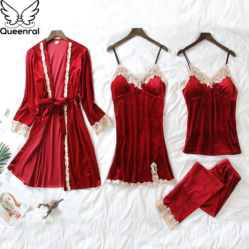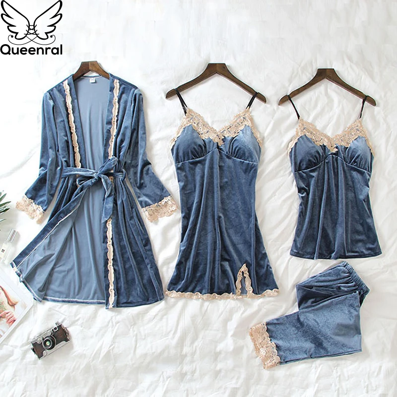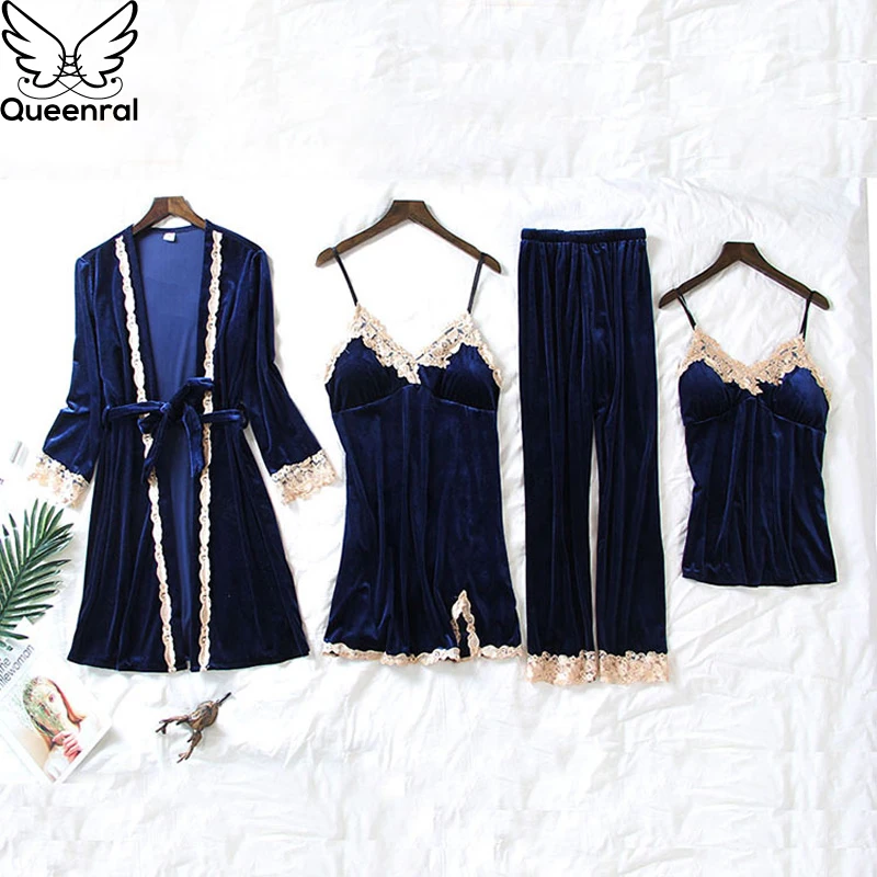 Queenral 4PCS Gold Velvet Pajamas Sets For Women Warm Winter Sexy Lace Pyjamas Nightdress Sleepwear Long Sleeve Nightwear