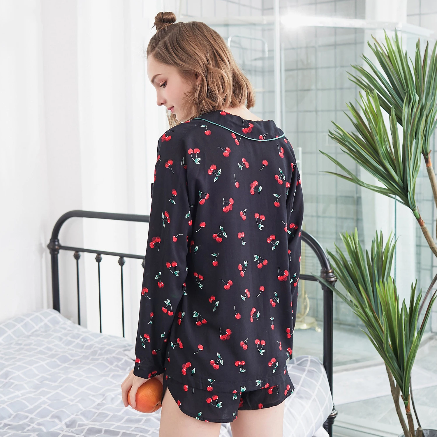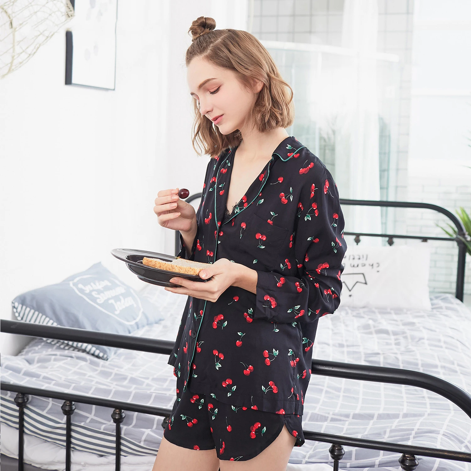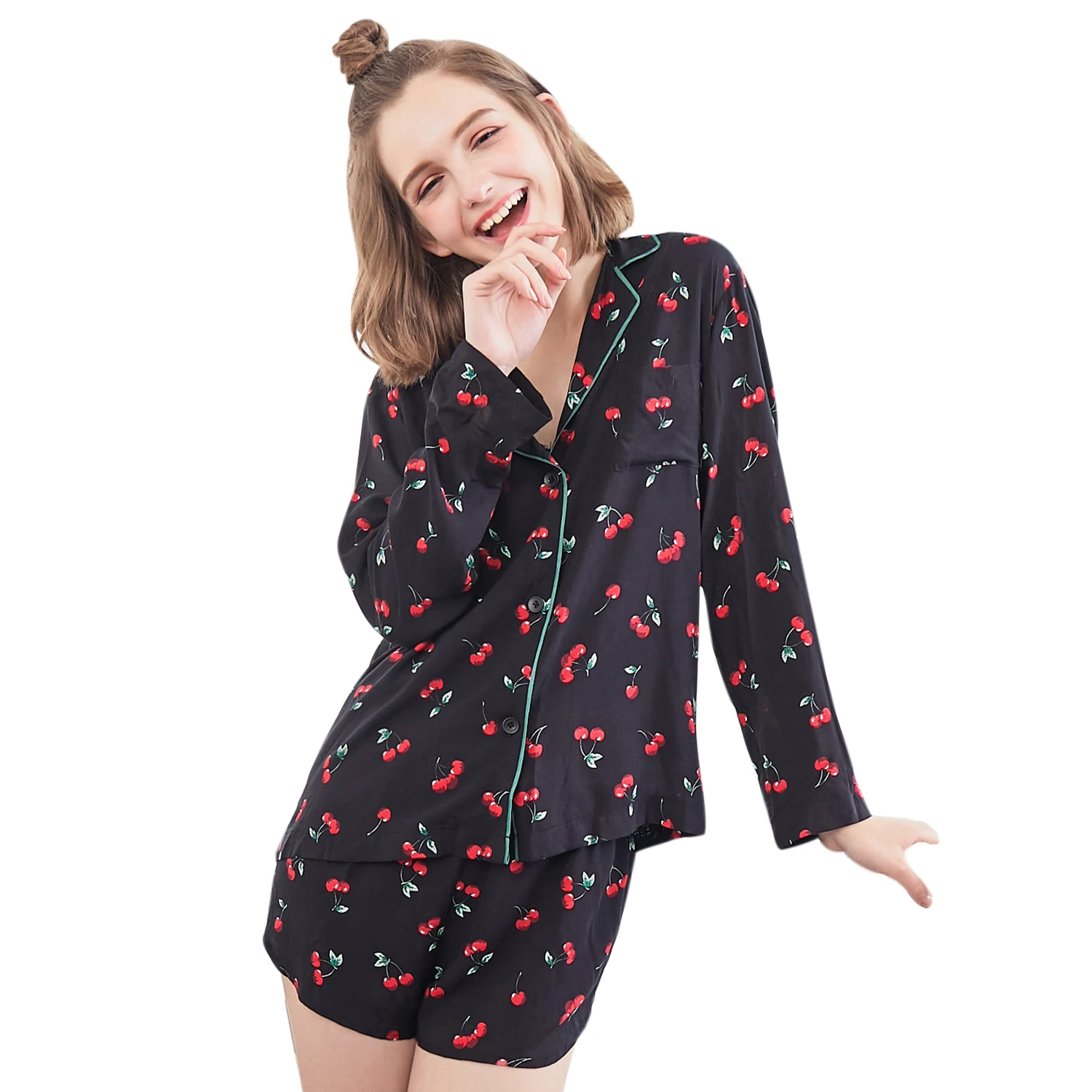 Women 2 Pieces Pajamas Set Ladies Cherry Print Pajamas Set Shirt+Shorts Sleepwear Home Clothing