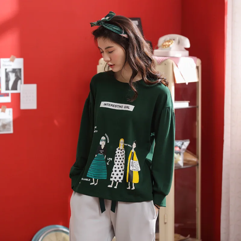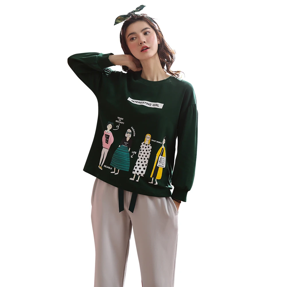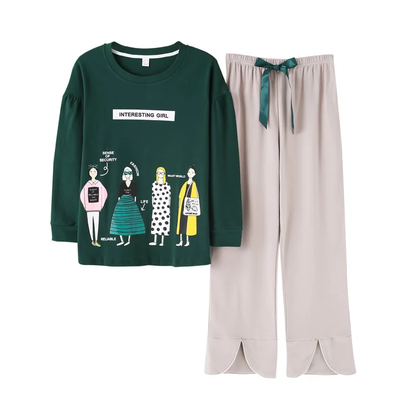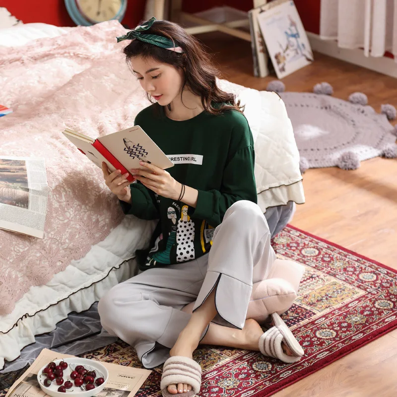 Autumn Cotton Pajamas for Women 2 Pieces Ladies Home Sleeping Clothing Long Pant Dark Green Sports Leisure Wear pyjama pigiama