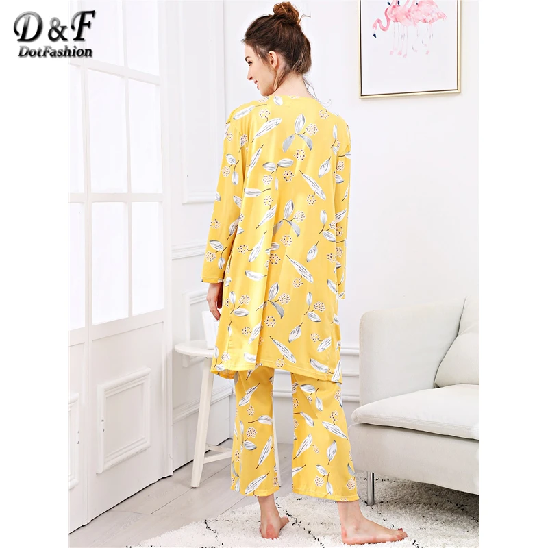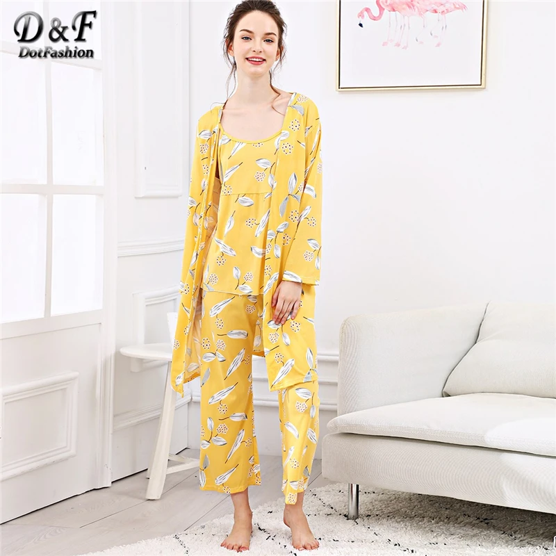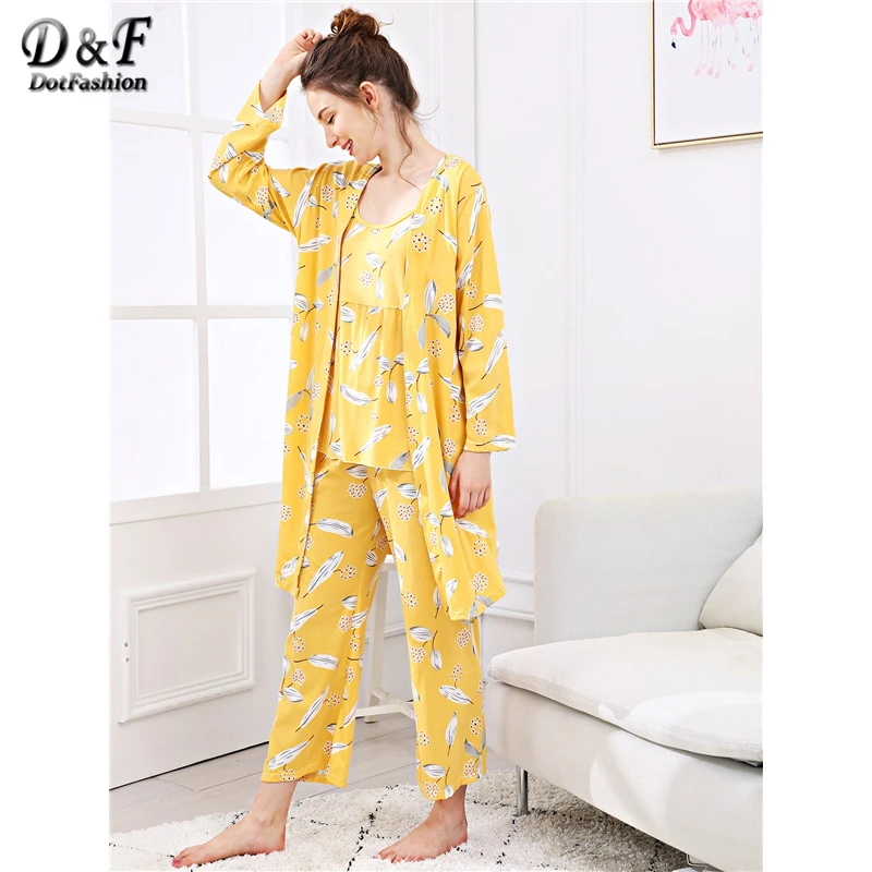 Dotfashion Yellow Leaf Print Cami Pajama Set With Robe Women Fall Clothing 2018 Casual Summer Long Sleeve Nightwear Pajama Sets