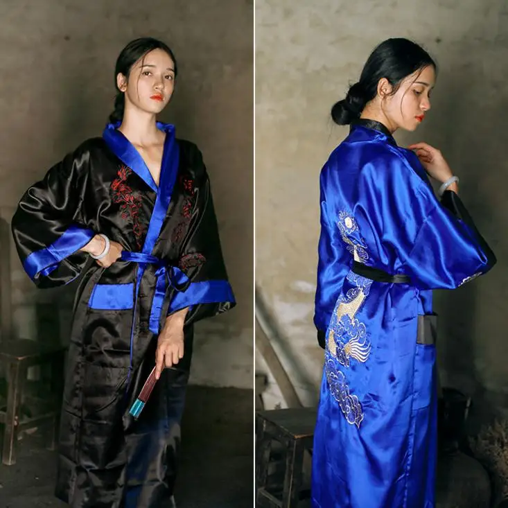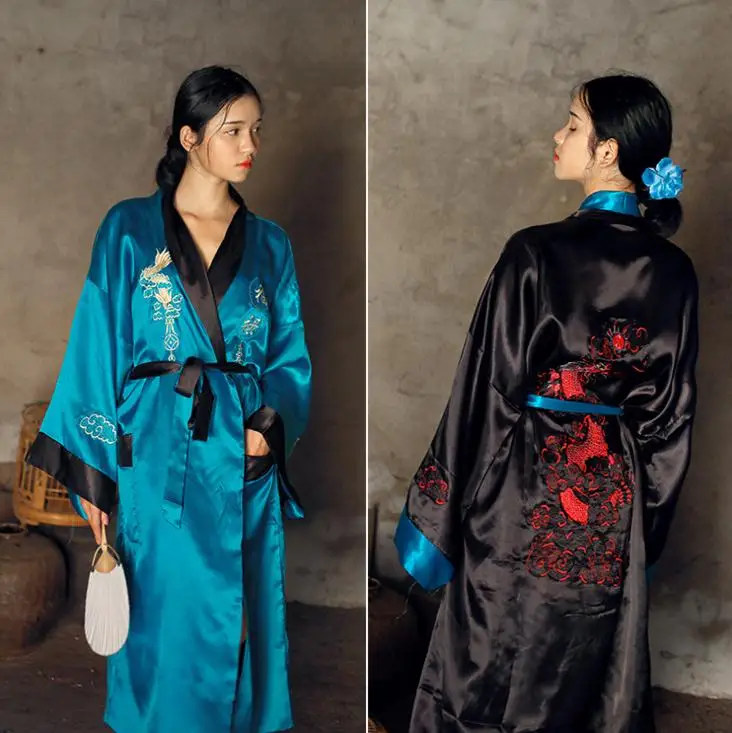 Novelty Reversible Black Red Women Kimono Yukata Satin Embroidery Dragon Nightgown Plus Size Robe Gown Two Side Sleepwear JA08