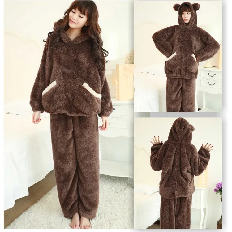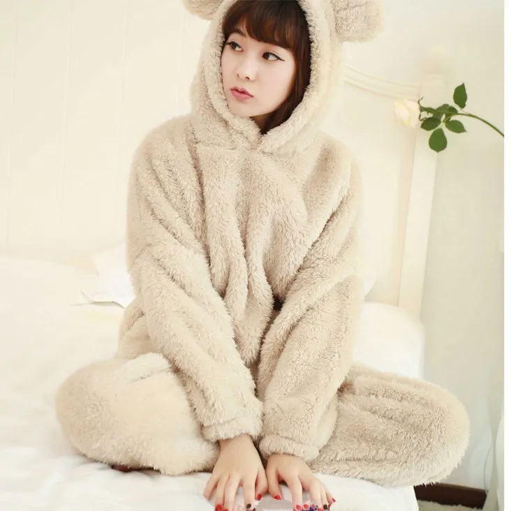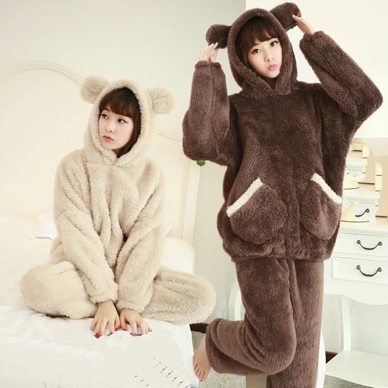 2018 New Autumn Women Flannel Pajamas Set Bear Hooded Pajamas Sleepwear Solid Coral Fleece Thickened Warm Pyjamas Home Suit