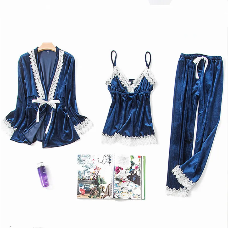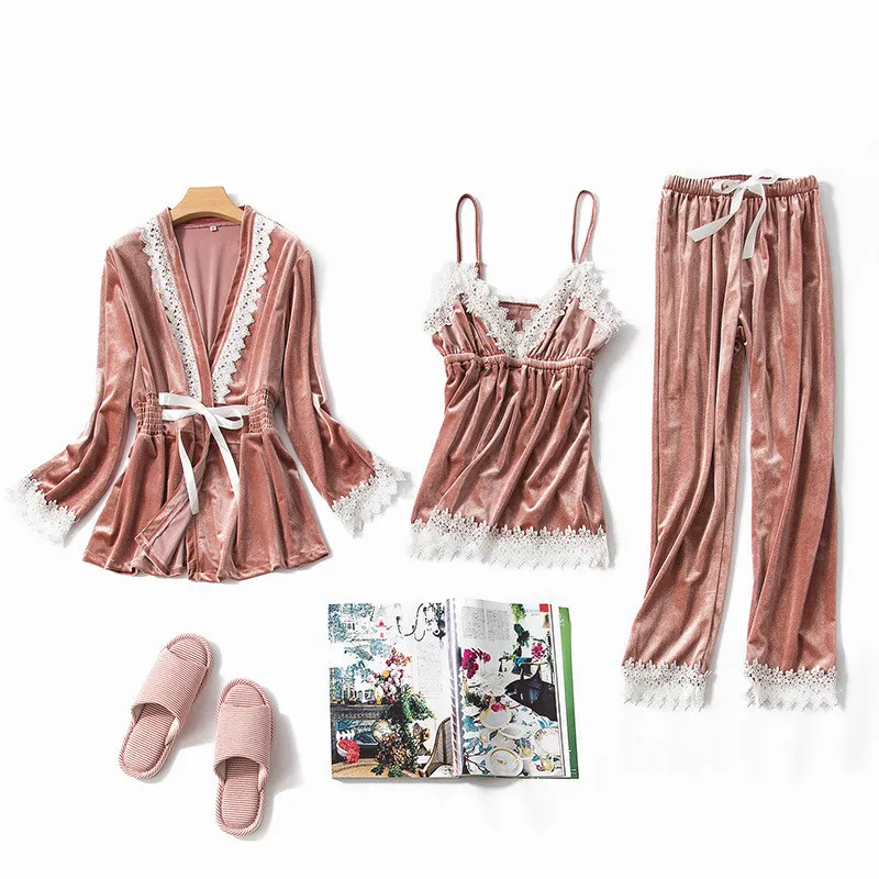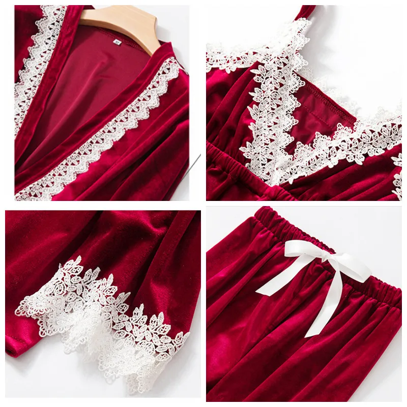 JULY'S SONG Fashion Gold Velvet 3 Peices Warm Pajamas Set Women Sexy Lace Sling Pajamas Winter Sleepwear Long Sleeves Nightwear