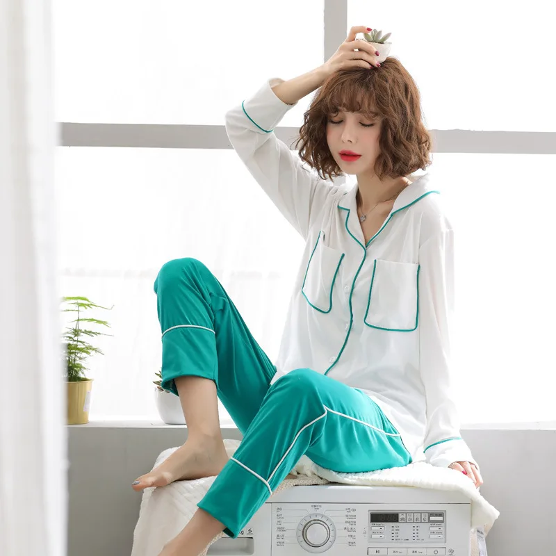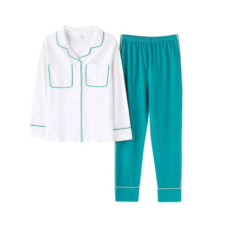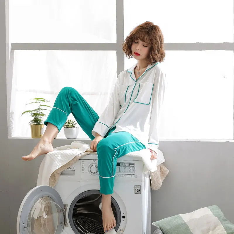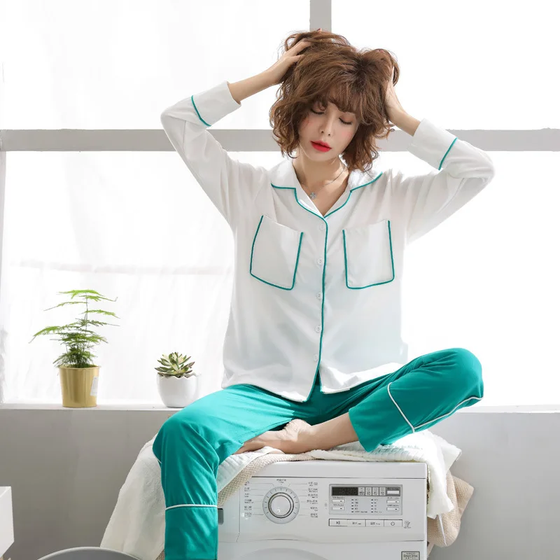 Long Sleeve Ladies Pijama Set Cotton cardigan Sleeping Clothes Two Pieces Pyjamas Women Home Wear Sleepwear Pockets Tops Pants