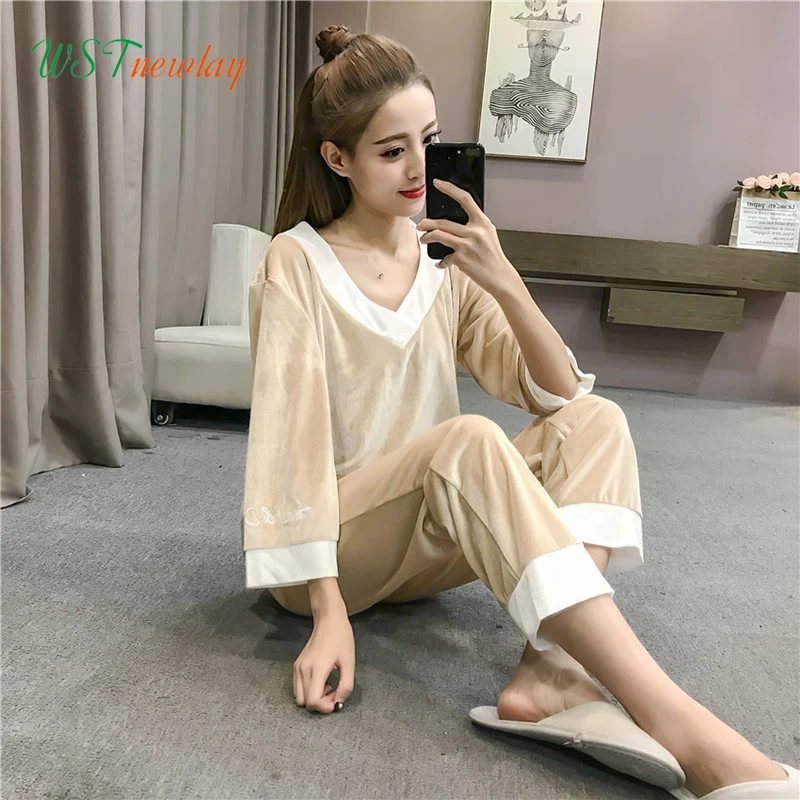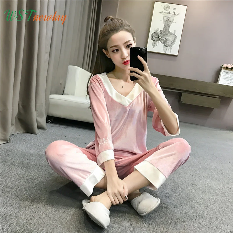Velutum Women Pajamas Set Home Sleepwear Warm Sexy Winter Femme Pjs Loose Pyjamas 2019 Spring Top Fashion Clothes