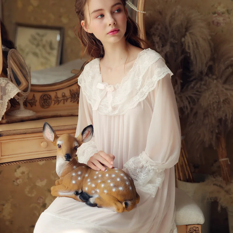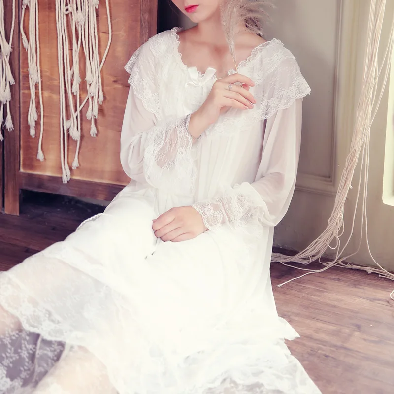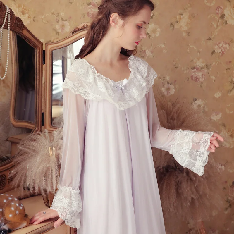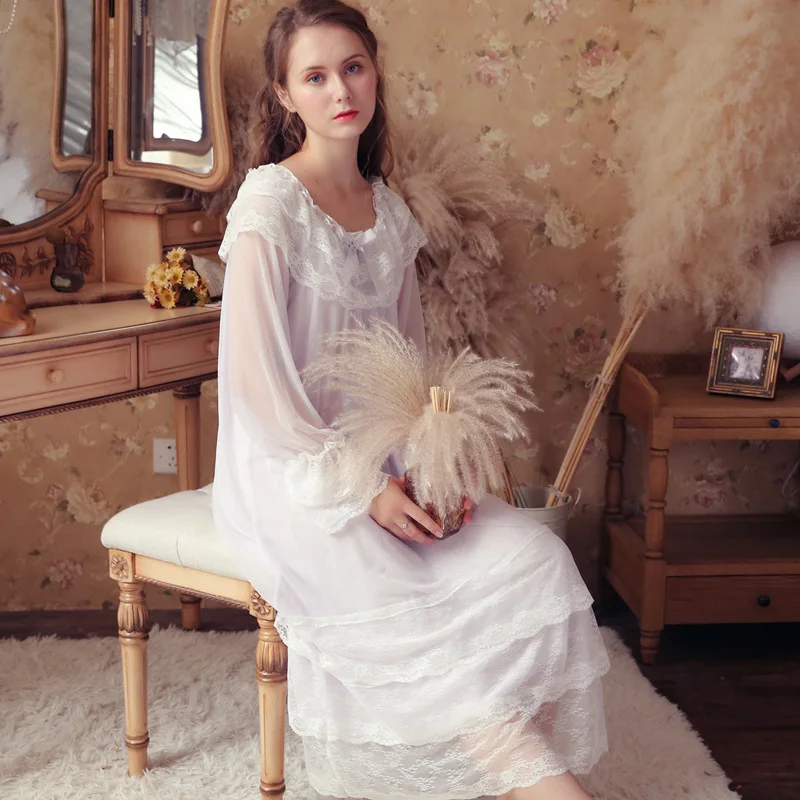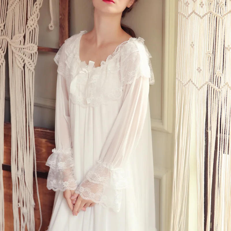 Lace Pyjamas Women Spring And Autumn Princess Sweet Mesh Retro Court Modal Dress Home Long Cotton Nightdress Women HZL80