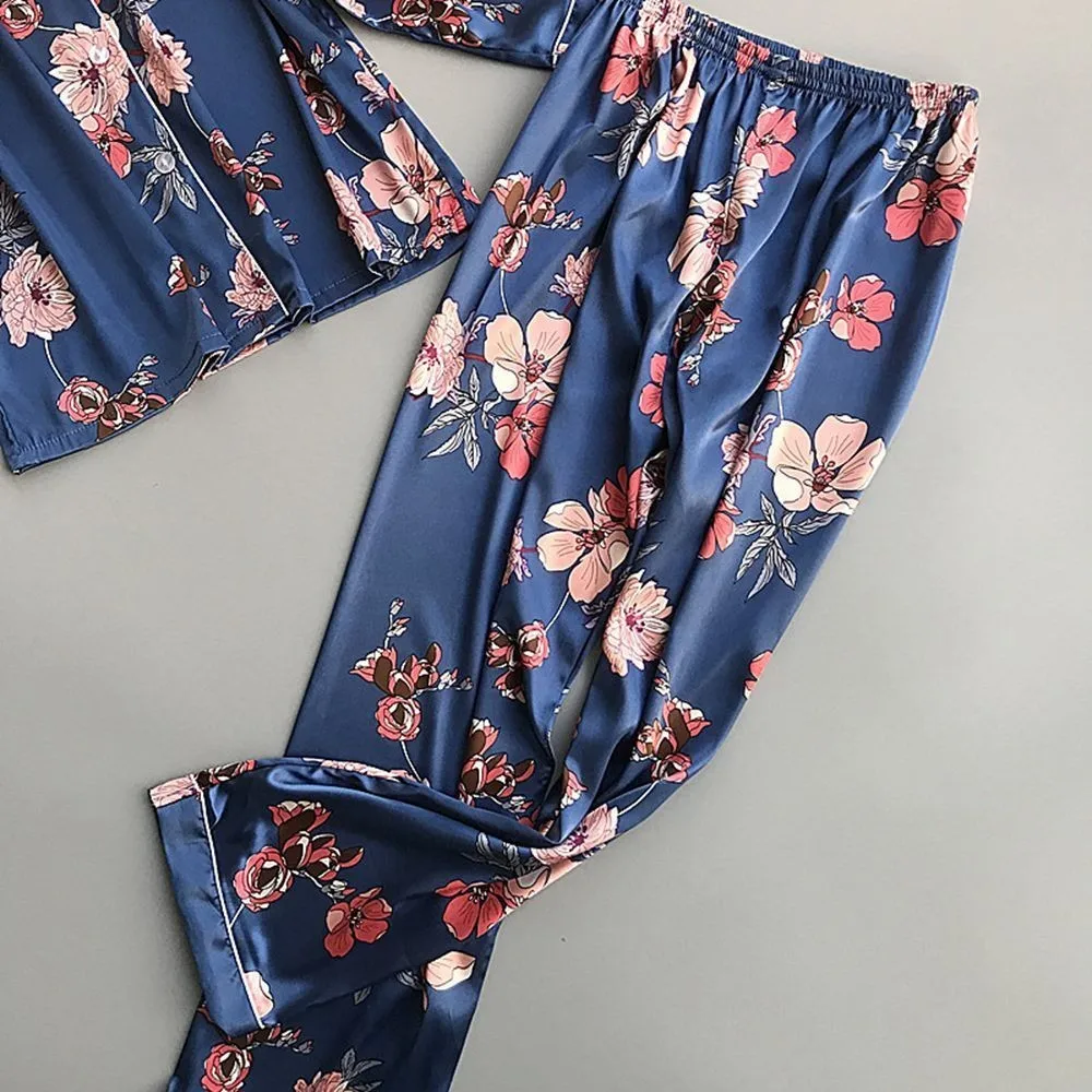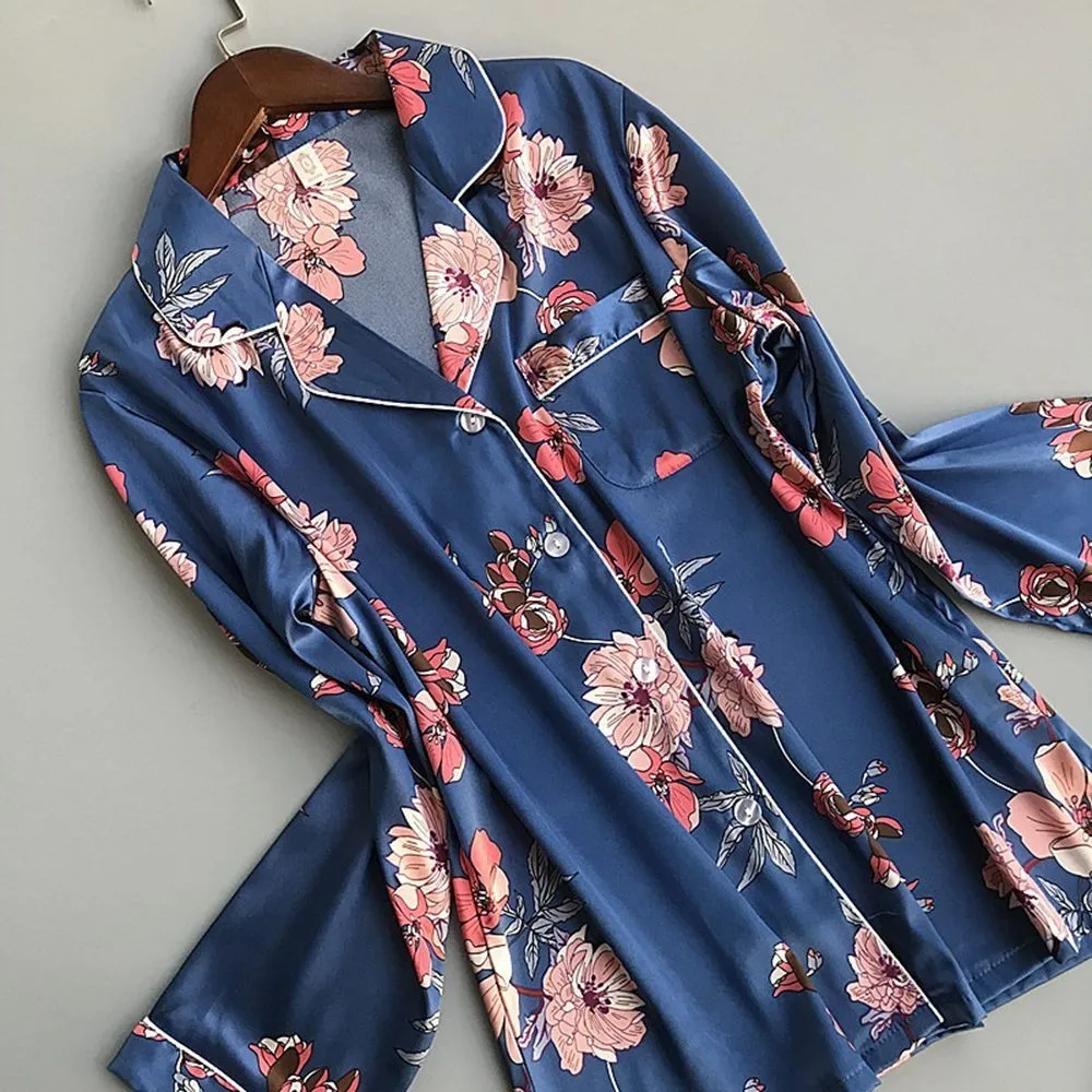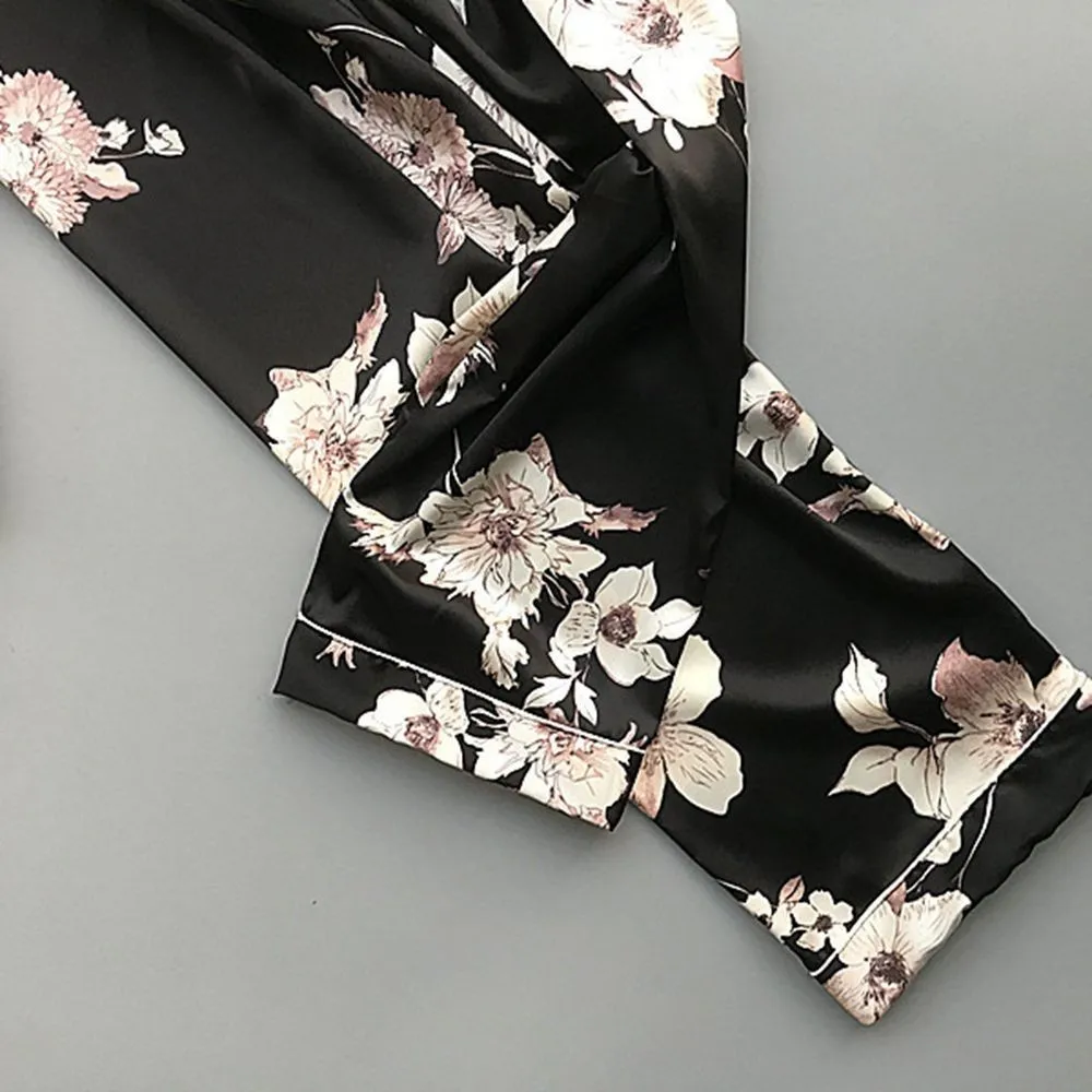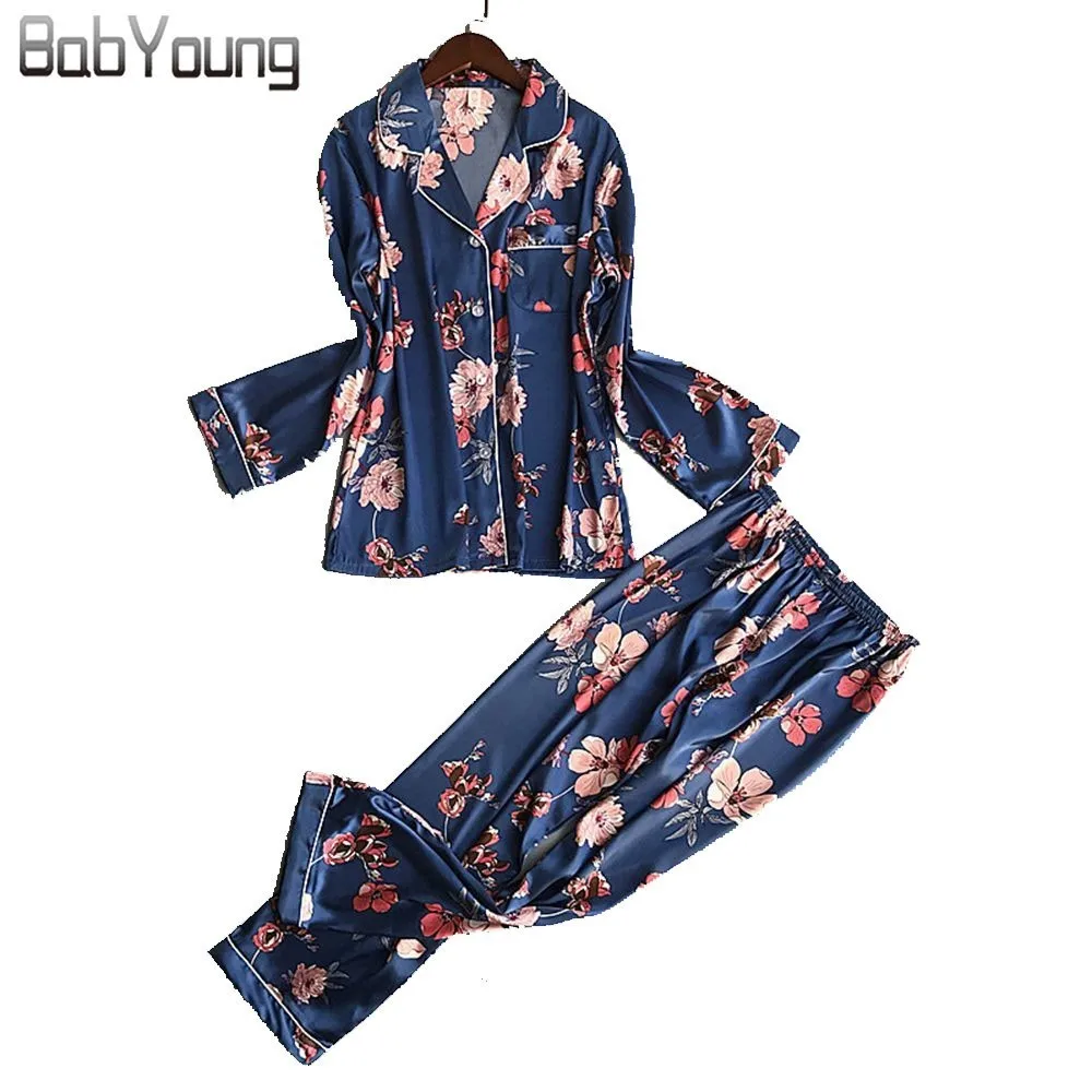 BabYoung Summer New Women Pajamas Set Pyjamas Femme Flower Silk Satin Sleepwear Long Sleeve Night Wear Pijama Mujer Home Suit