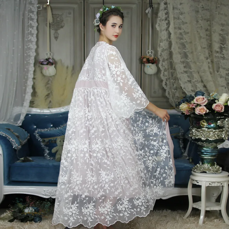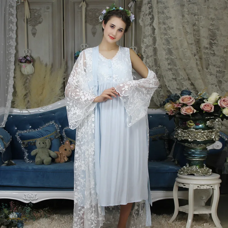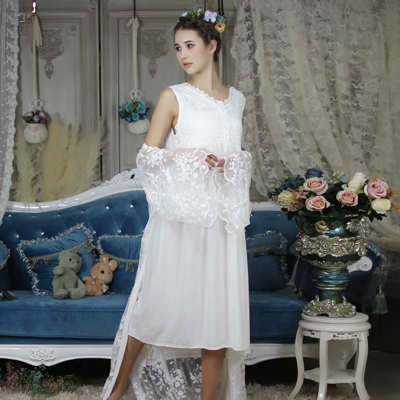 Mesh Embroidery Two-Piece Princess Sleepwear Female Casual Sleeping Robe + Nightdress Elegant Vintage Lady Bathrobes Sets BL063