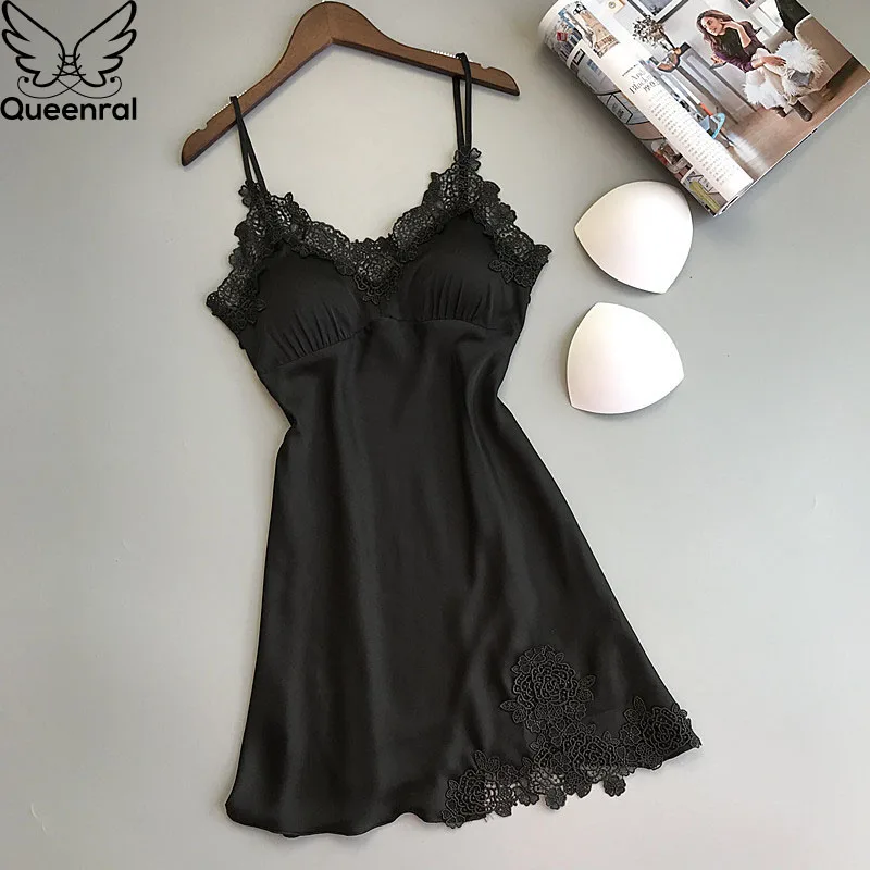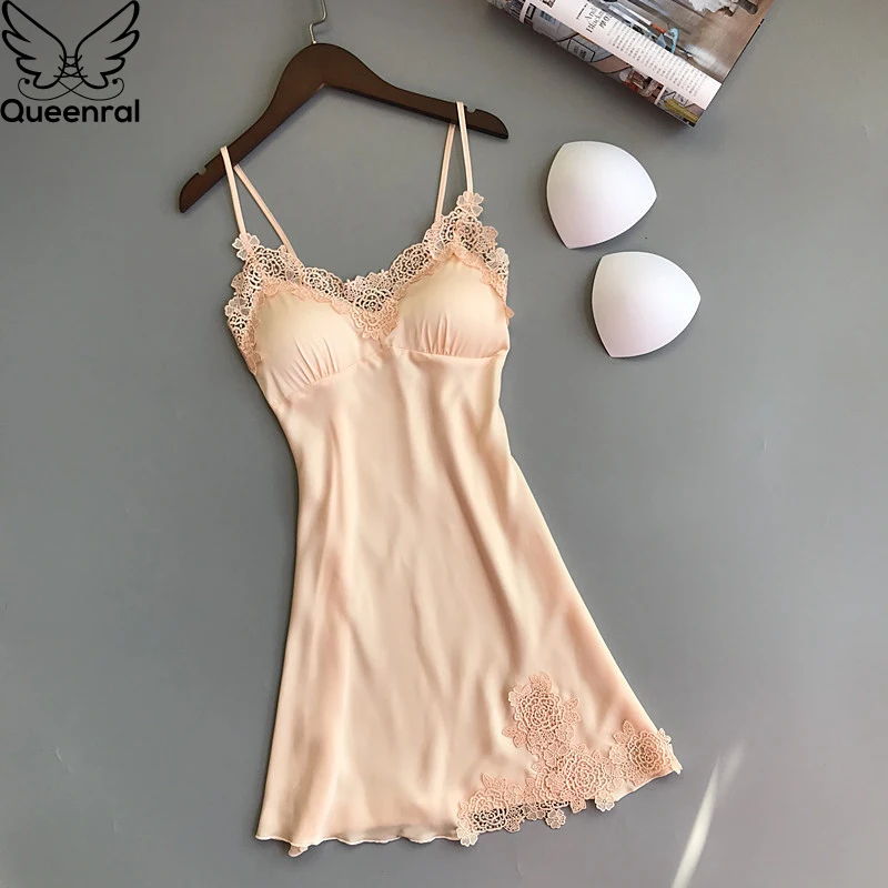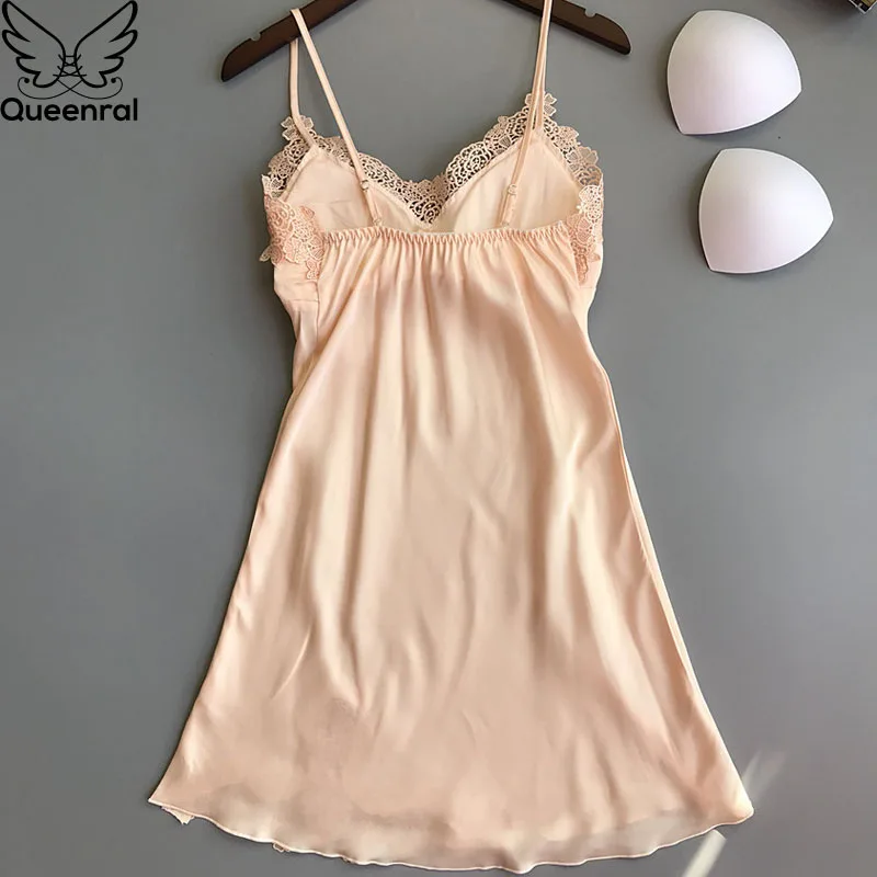 Queenral Women Nightgowns Summer Dress Sleepshirts Satin Night Dress Female Sexy Nightgowns Sleepwear Chest Pads Homewear