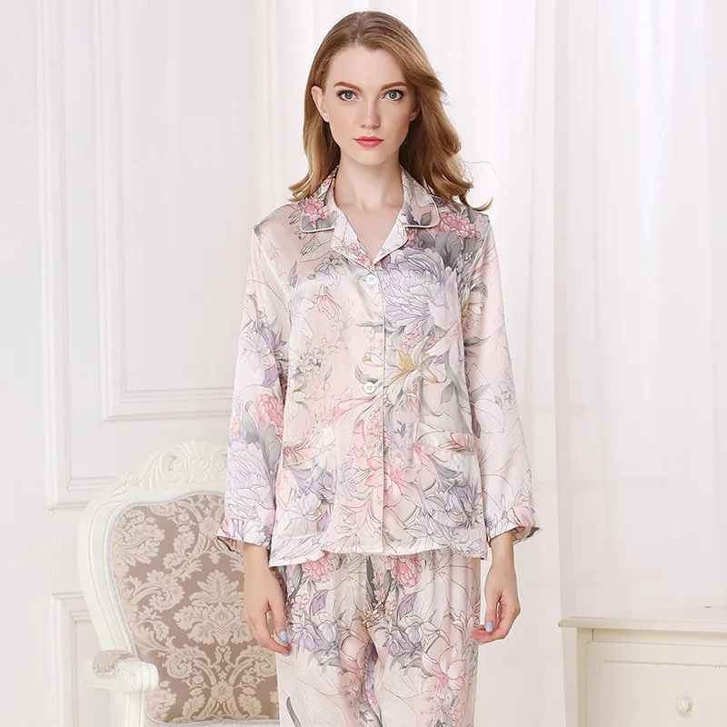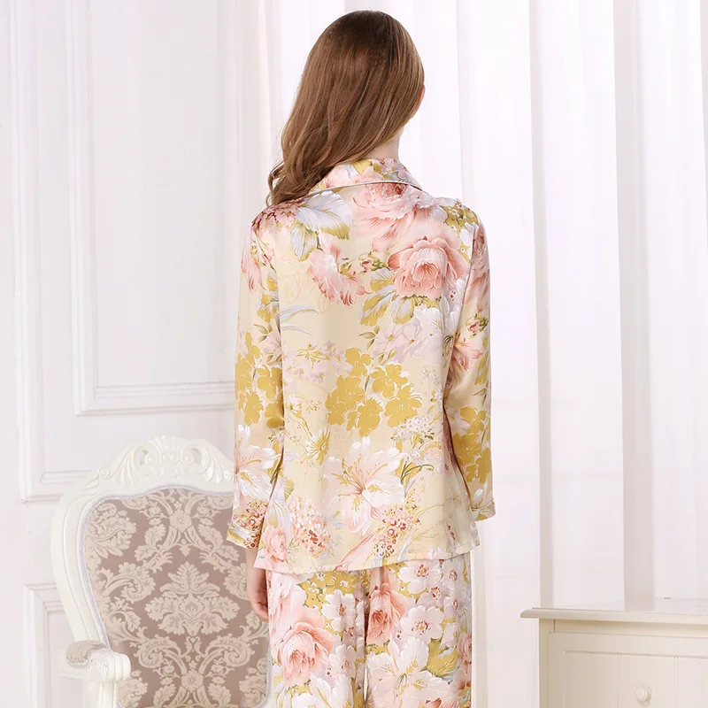 Real Silk Pajama Female 100% SILK Sleepwear Women Long-Sleeve Pyjama Pants Two-Piece Sets High Quality Home Clothing T8122