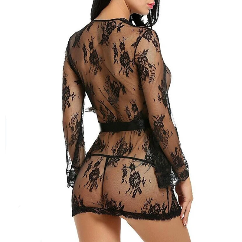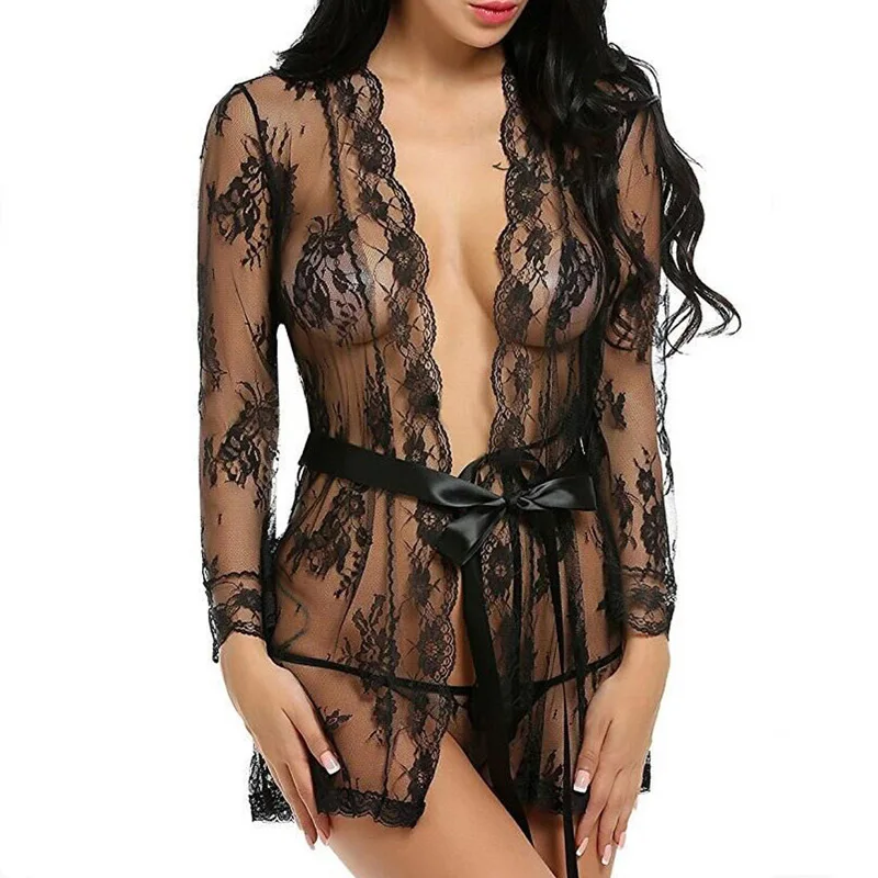 Sexy Robe Transparent Lace Underwear Sleepwear Long Robe Silk Bath Robes For Women Lingerie Nightgown Floral Mesh Robe
