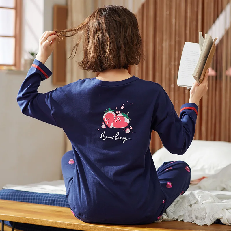 Spring And Autumn Cartoon Strawberry Full Sleeve Pure Cotton Lady Pajamas Homewear Thin Sets