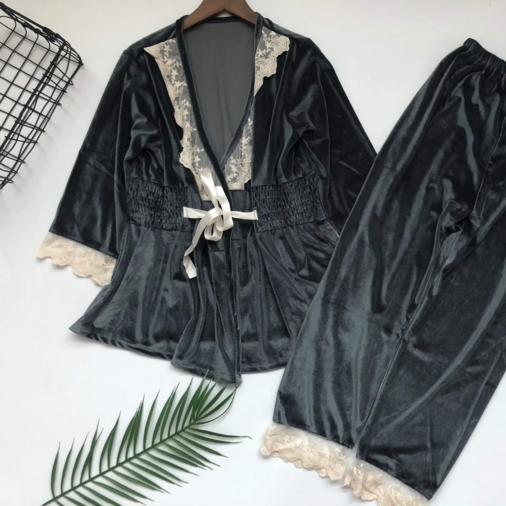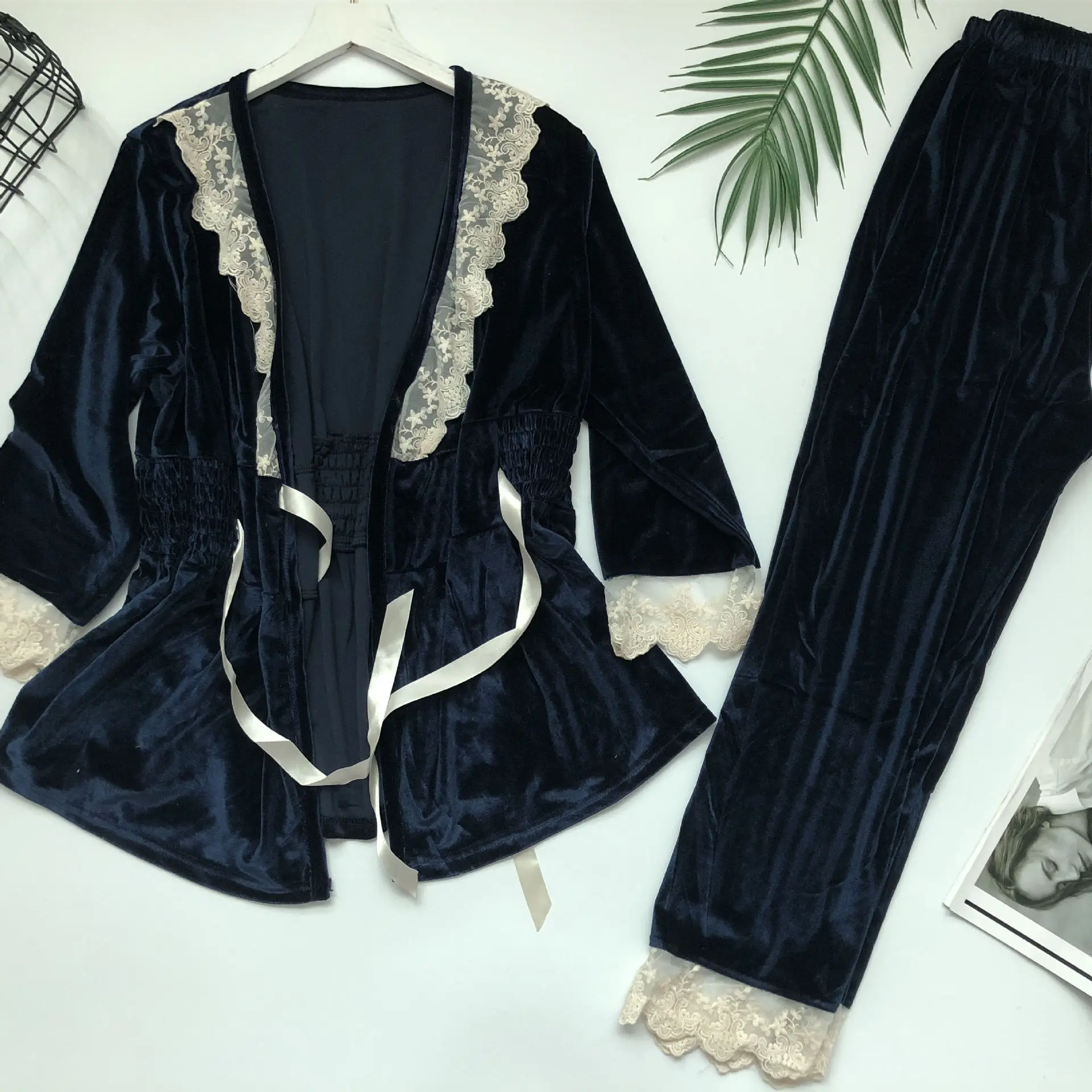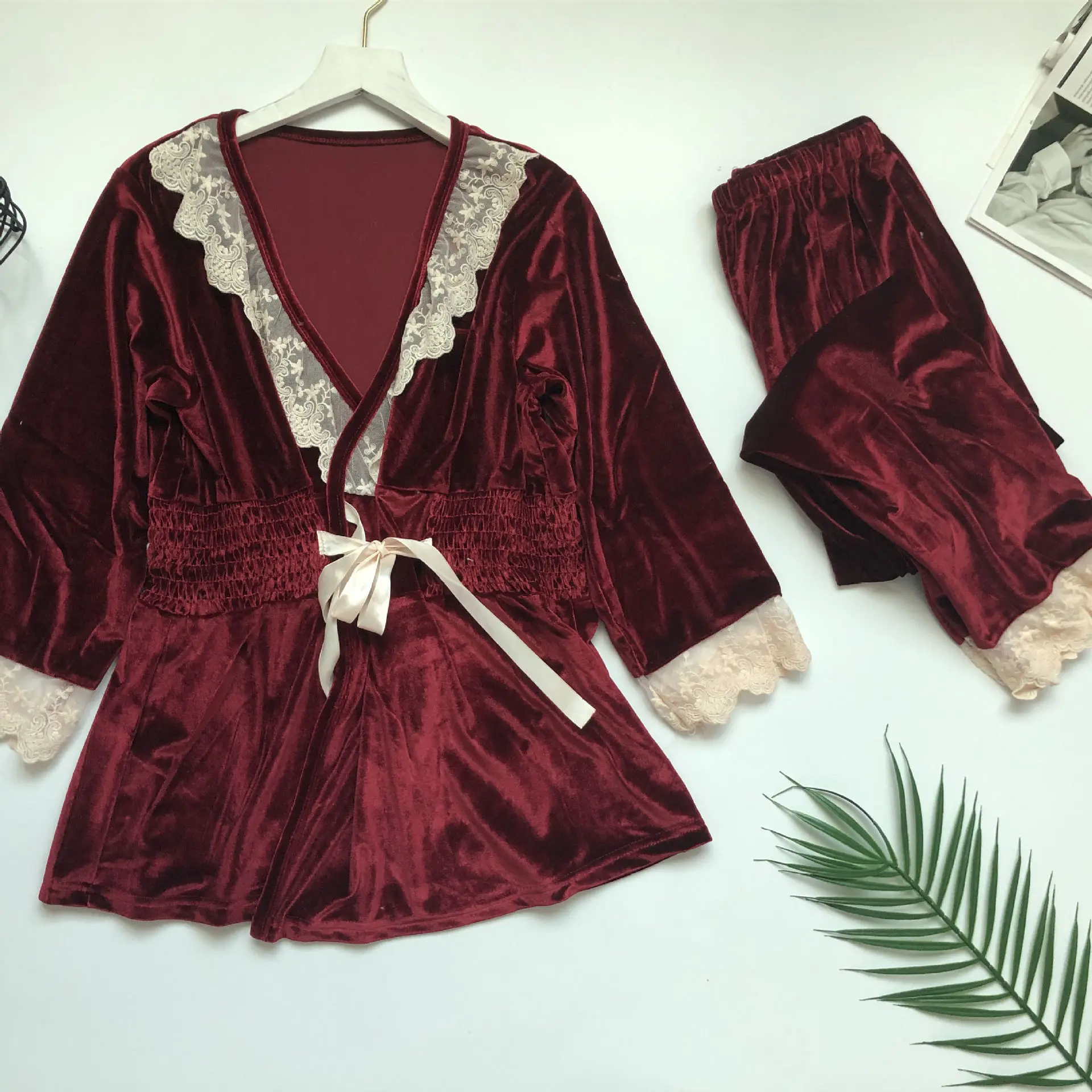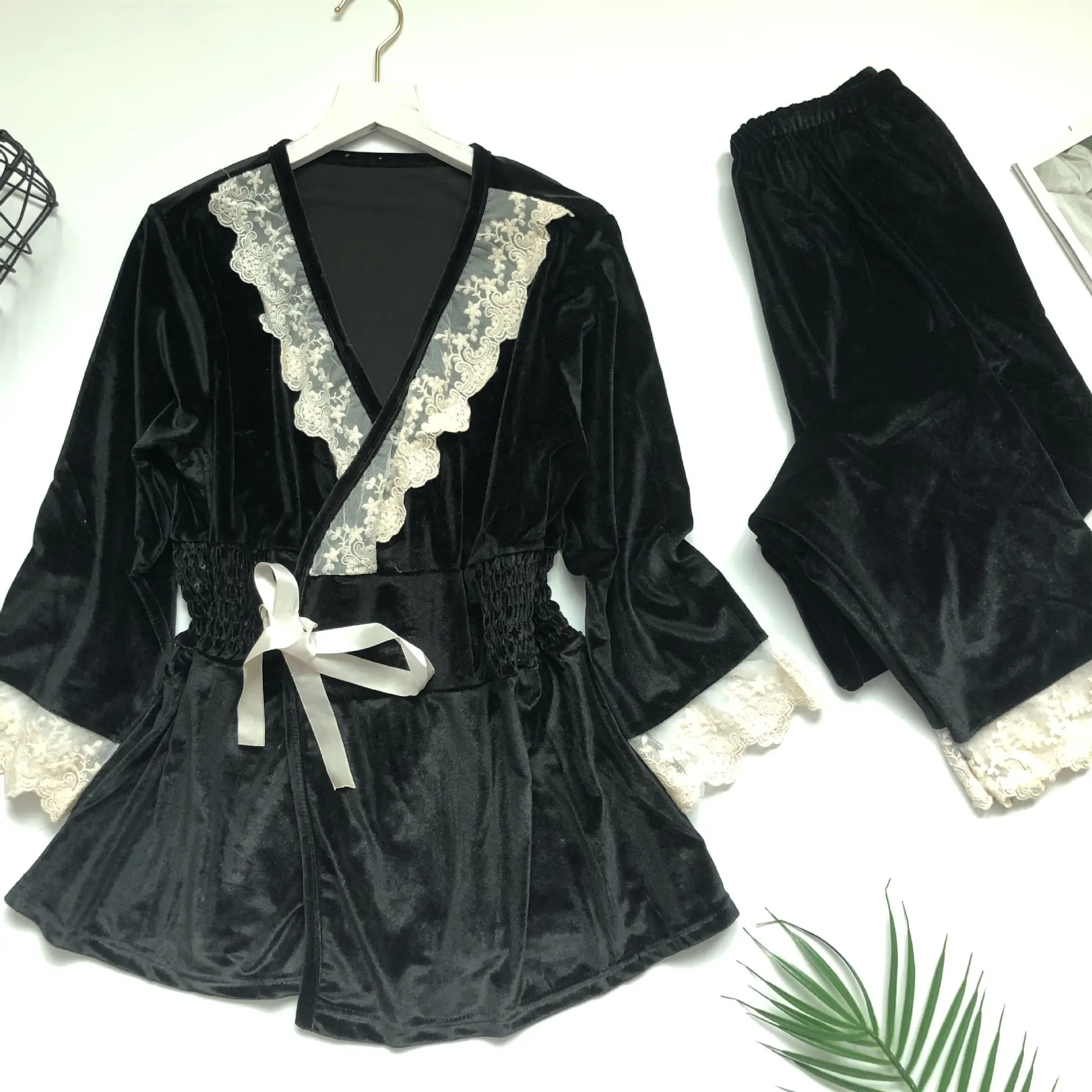 2019 pajama sets women Velvet Lace Ladies Nightgown Long Sleeves Home Wear Two Piece Set lingerie sexy pajamas pyjamas mujer