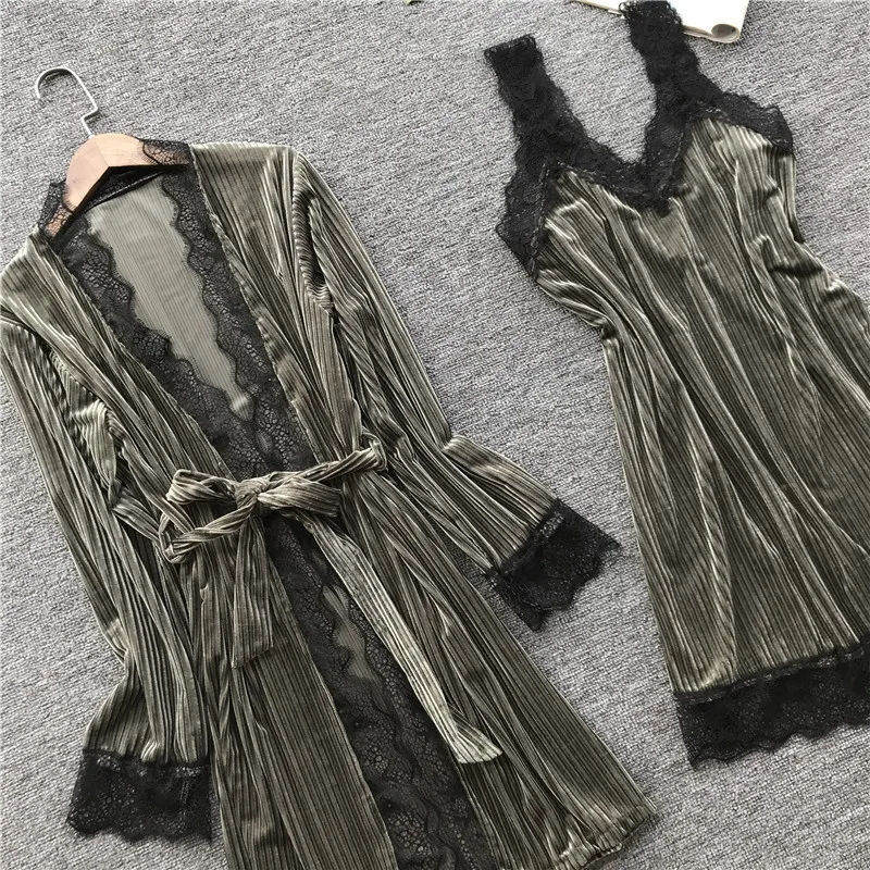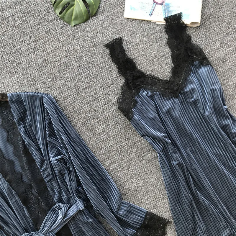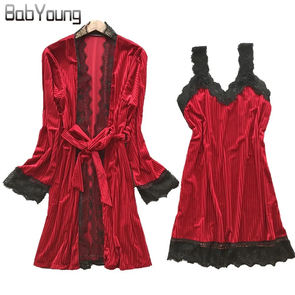 BabYoung Winter Warm Women Robes Set Lace Velvet Patchwork Long Sleeve Bathrobe Sexy Night Dress Gown Spaghetti Strap Lounge Red