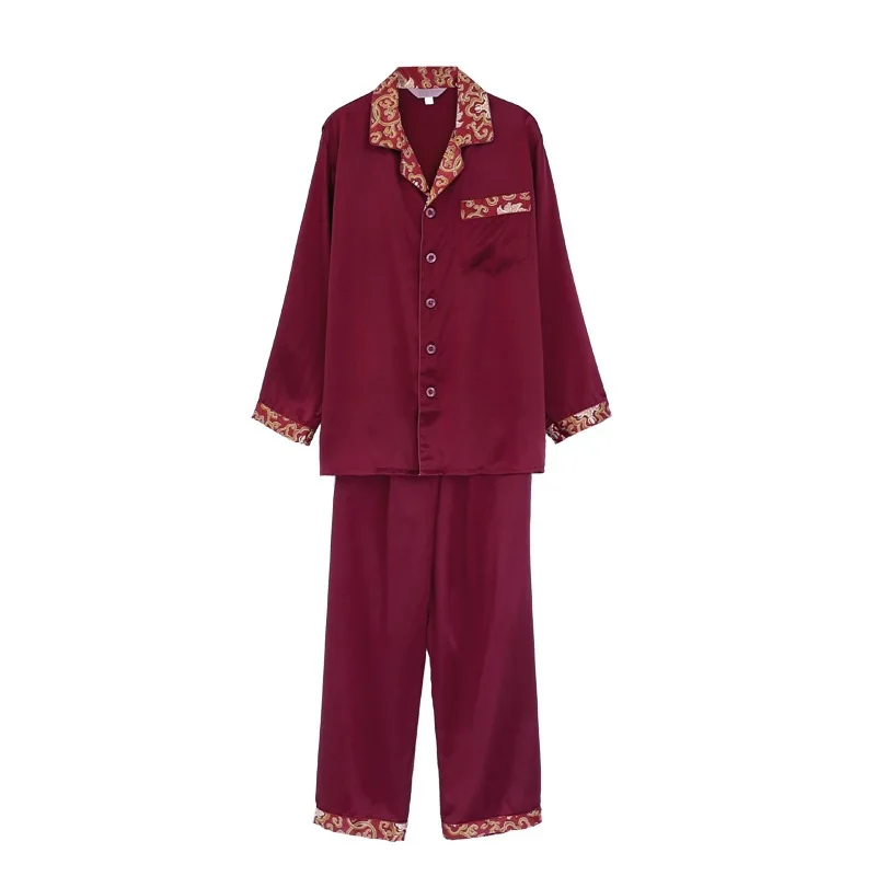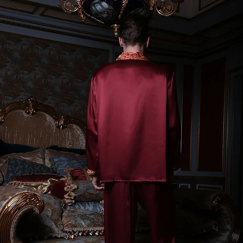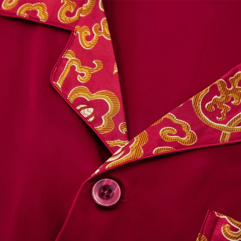 Fashion Brand Real Silk Couple Pajama Two-Piece Red 100% Silk Sleepwear Female Male Spring Autumn Long-Sleeved Pyjama Sets OY11