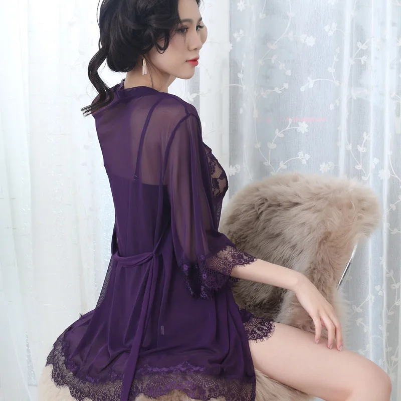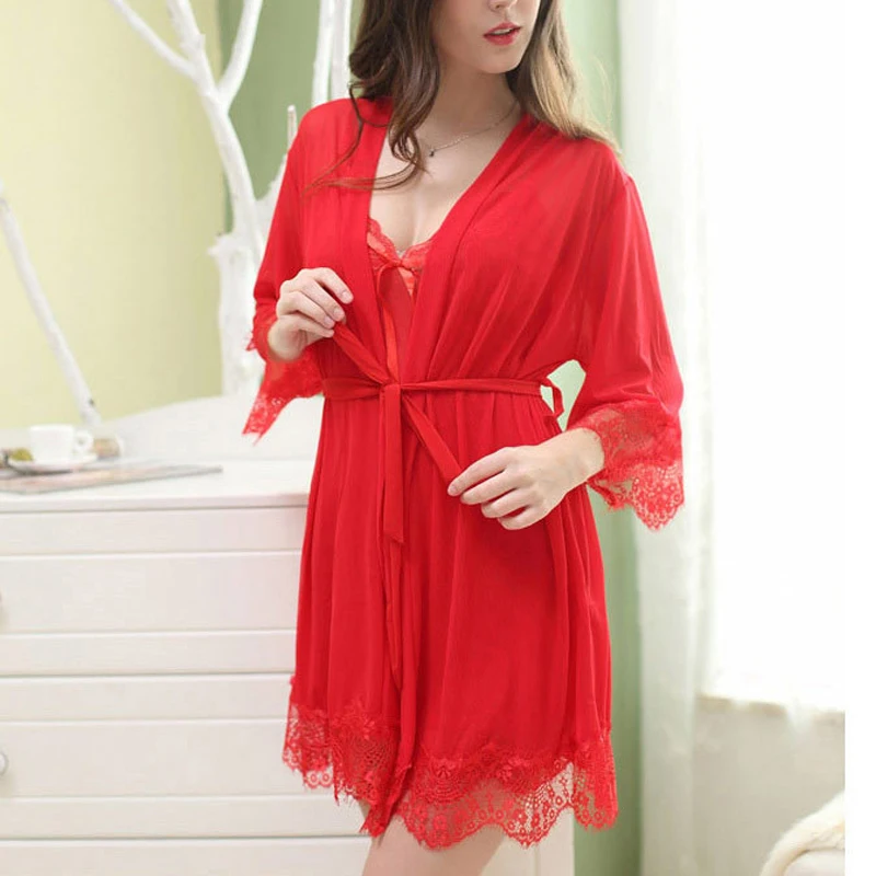 GUMPRUN Women Robe Sexy Deep V Neck Lace Robe Ultra-thin Net Yarn Sleepwear Women Pyjama 3 Pieces Set Transparent Short Robe Set