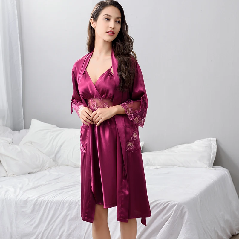 Xifenni Robe Sets Female Sexy Satin Silk Sleepwear Women V-Neck Embroidery Faux Silk Sleeping Gown Two-Piece Bathrobes X20242