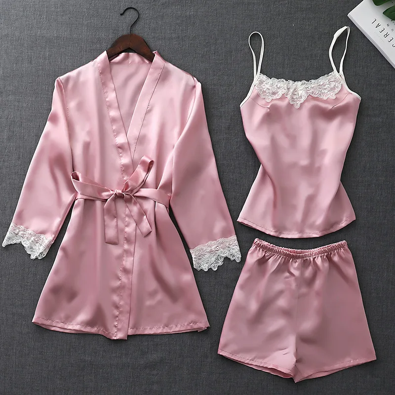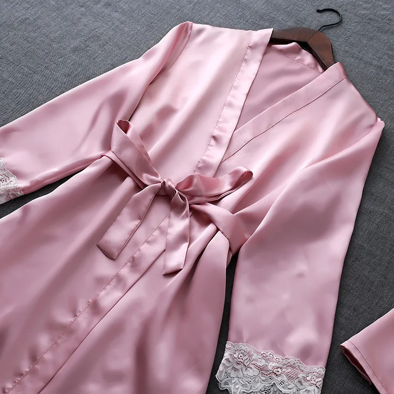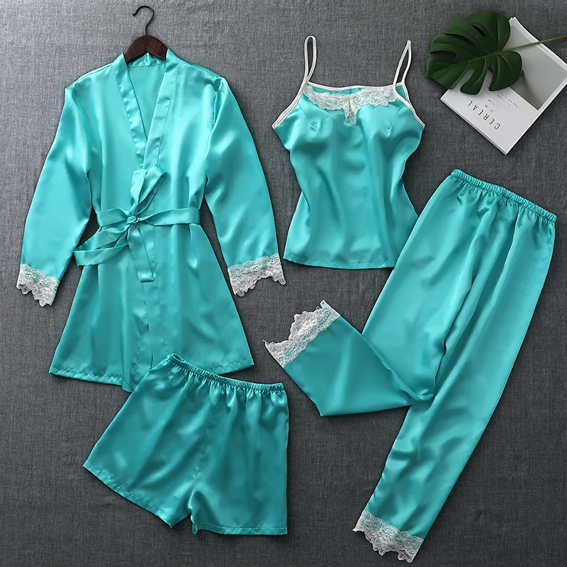 ZOOLIM Autumn Silk Pajamas Sets for Women 4 Pieces Pijamas with Belt Satin Sleepwear Elegant Lace Nightwear Sexy Sleep Lounge
