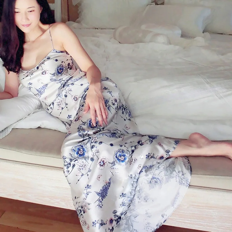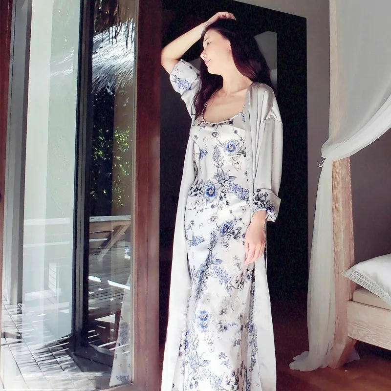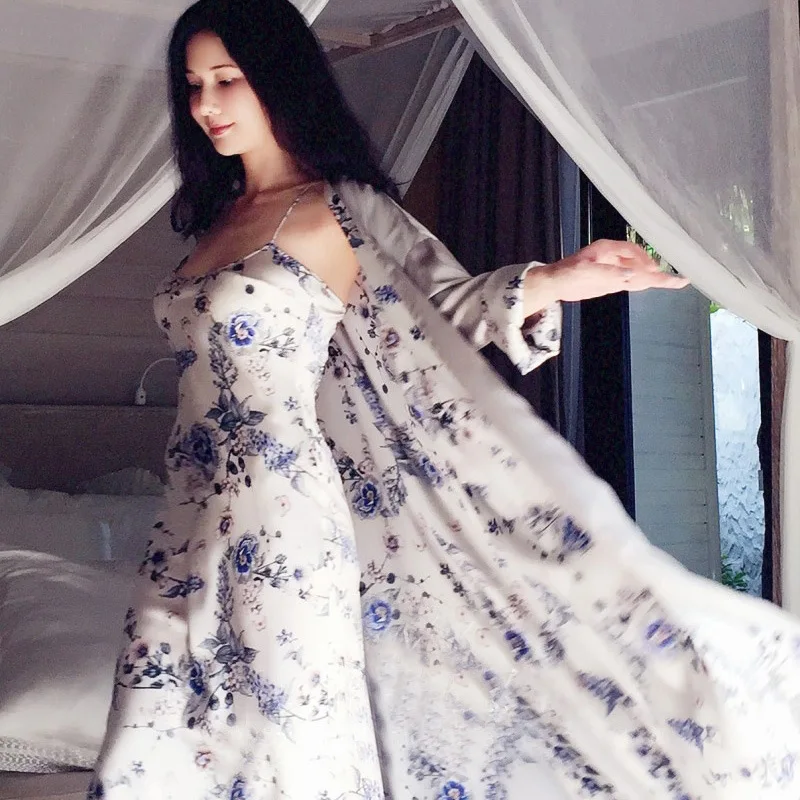 Autumn Winter Silk Sleepwear Female Two-Piece Ice SILK Sling Nightdress Elegant Printed Woman Robe Sets Bathrobes Kimono LMR08