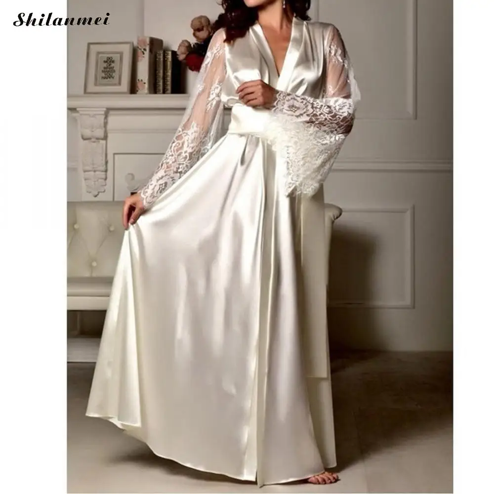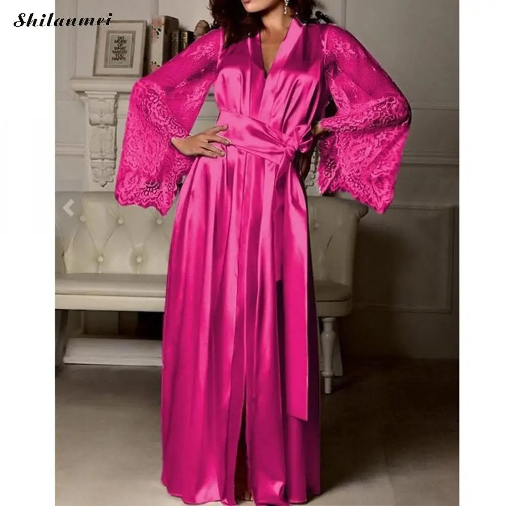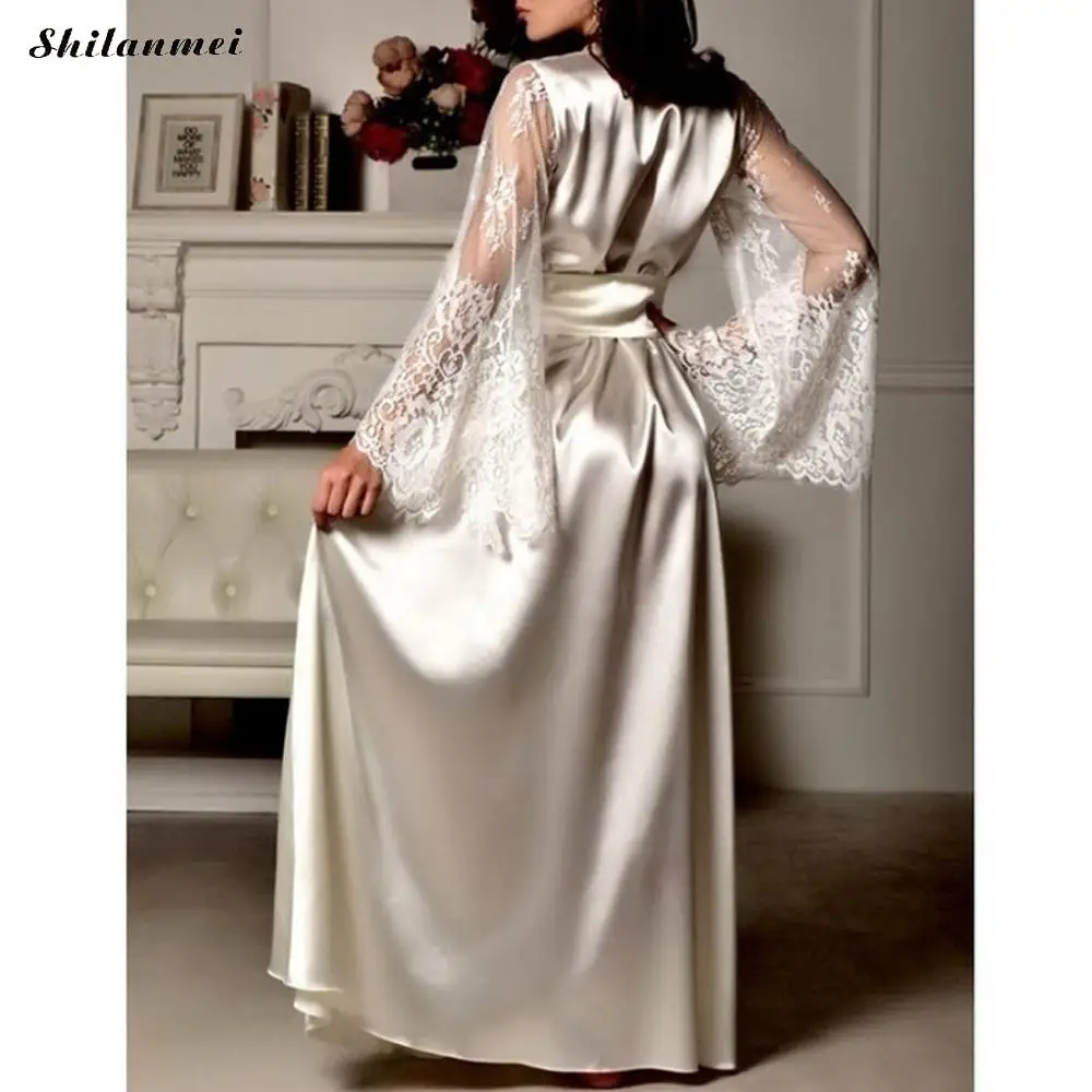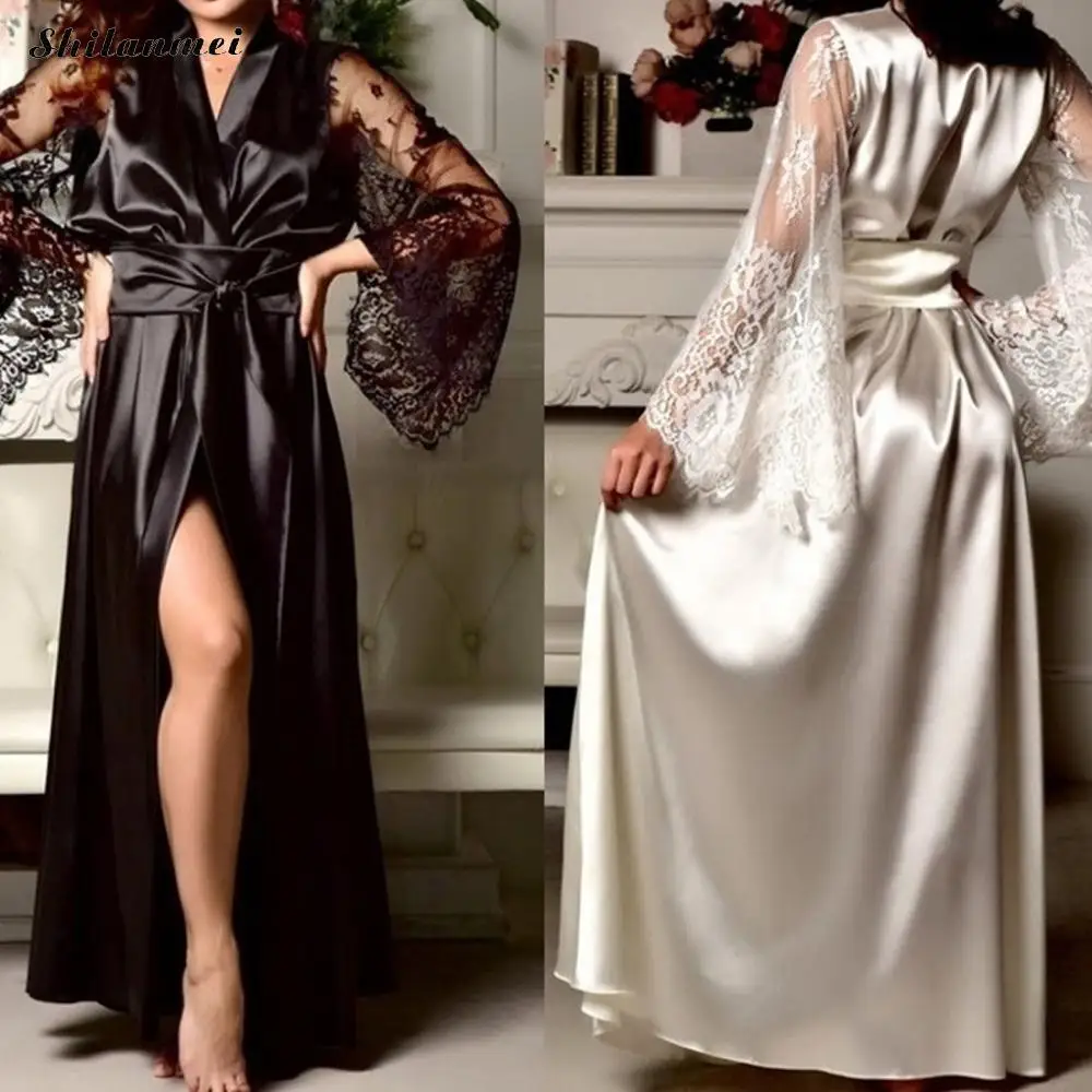 New Lingerie Sleepwear Satin Lace Sexy Women Sissy Long Sleeve Loose Bathrobe Kimono Babydoll Nightwear Robe Deep V Bathrobe